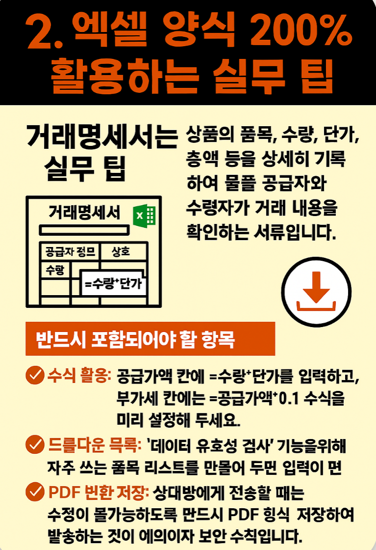 - 수식 활용: 공급가액 칸에 =수량*단가를 입력하고, 부가세 칸에는 =공급가액*0.1 수식을 미리 설정해 두세요.