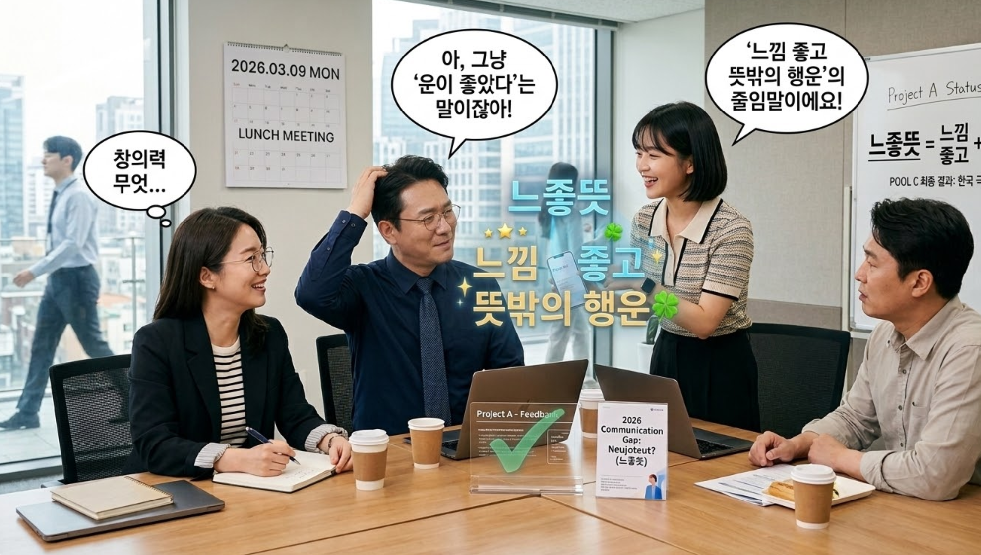 "과장님, 이번 프로젝트 '느좋뜻' 인데요?" 최근 점심시간, 신입사원 김대리가 던진 한 마디에 회의실은 순간 정적이 흘렀습니다. 박 과장님은 물론, 저를 포함한 몇몇 '과장님 라인' 직원들은 서로의 눈치를 보며 고개를 갸웃거렸죠. '느좋뜻'이라니, 도대체 무슨 의미일까요? 직장 생활 15년 차인 저도 처음 들어보는 말에 살짝 당황했지만, 이내 흥미가 생겼습니다. 2026년 오늘날, 직장 내 세대 간 소통의 벽은 신조어라는 예상치 못한 형태로 나타나곤 하죠.