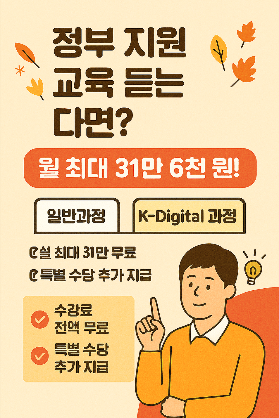 즉, K-Digital Training 과정을 수강하면 기본 116,000원 + 특별수당 200,000원 = 총 316,000원을 매달 받을 수 있습니다. 취업 준비생에게는 결코 적지 않은 금액이죠!