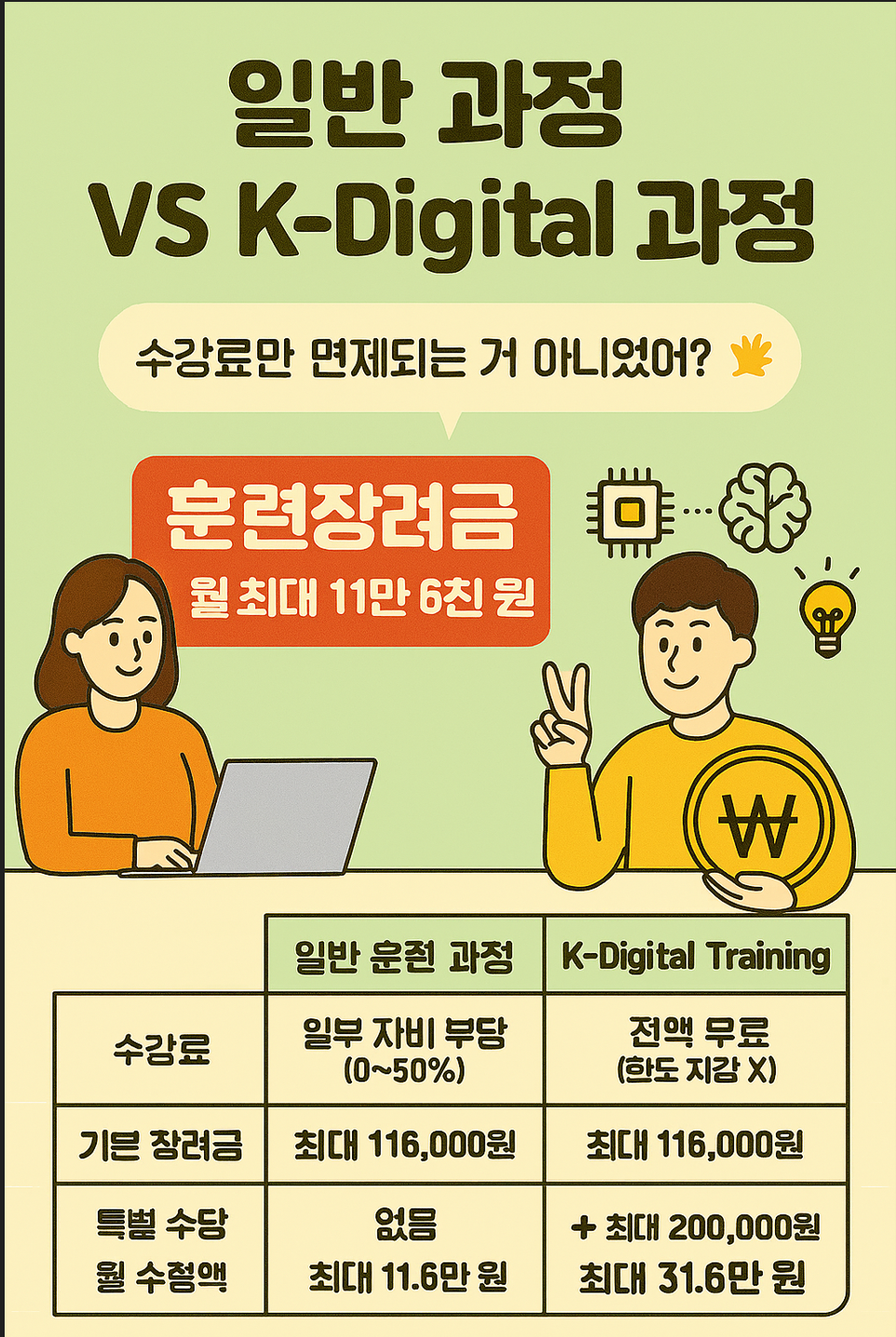 코딩, 빅데이터, AI 등 디지털 신기술 분야를 배우는 'K-Digital Training' 과정은 혜택이 훨씬 강력합니다. 정부가 핵심 인재 양성을 위해 전폭적으로 지원하기 때문입니다.일반 과정 vs K-Digital 과정 비교