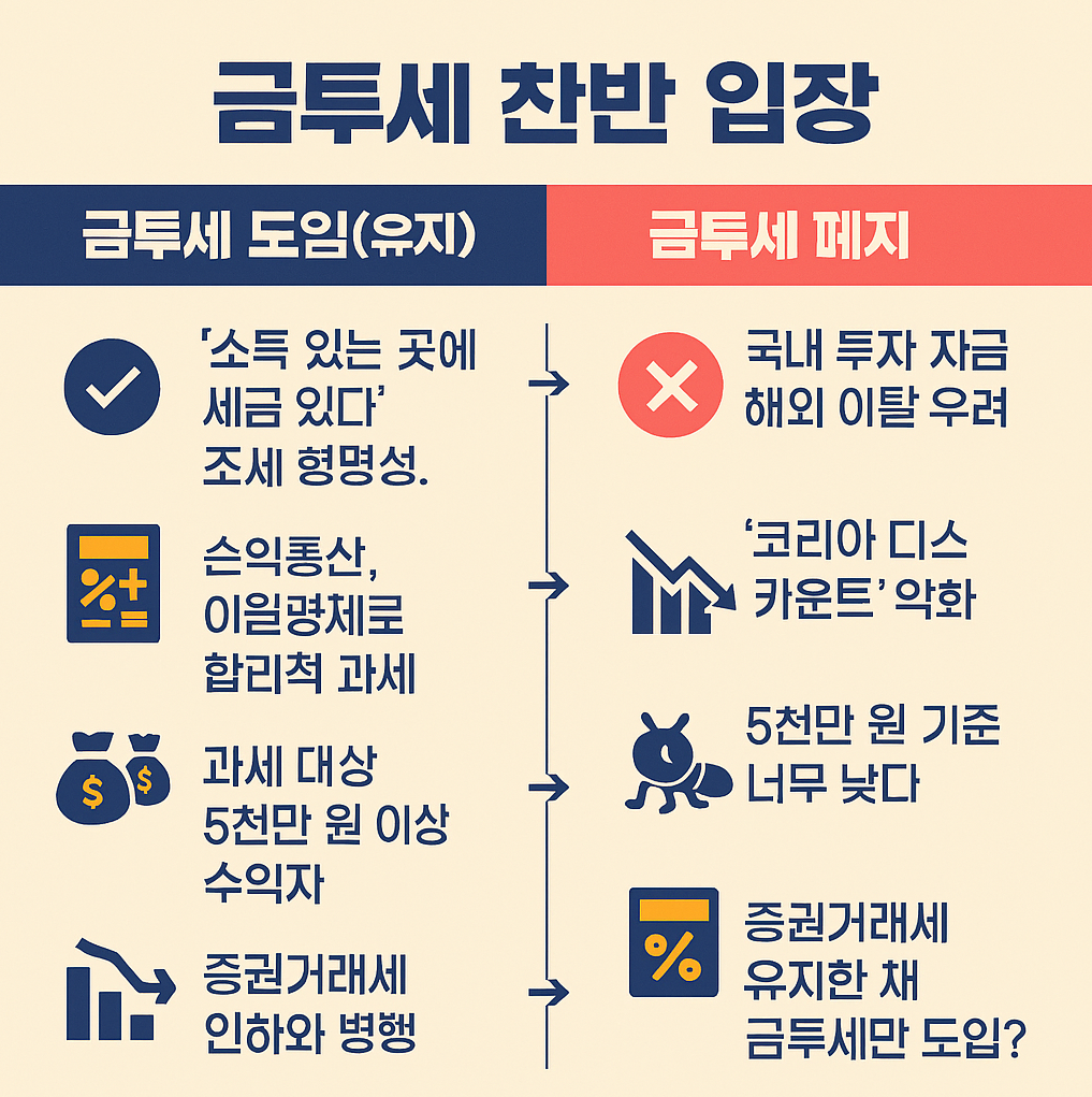 | ✅ 금투세 도입 (찬성/유지) | ❌ 금투세 폐지 (반대) |