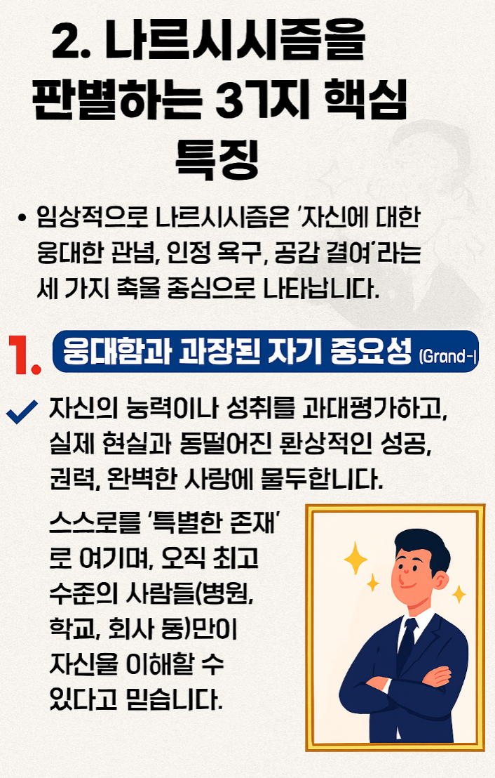 임상적으로 나르시시즘은 '자신에 대한 웅대한 관념, 인정 욕구, 공감 결여'라는 세 가지 축을 중심으로 나타납니다.
