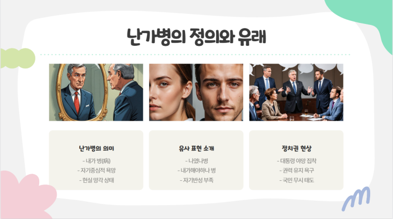‘난가병’이라는 표현은 사실 사전에 정식으로 등재된 단어는 아니에요. 하지만 이 표현은 ‘내가 병(病)’이라는 뜻을 가진 신조어로, ‘내가 뭐라도 되겠다는 욕망에 사로잡힌 상태’를 비유적으로 나타냅니다. 특히 이번 글에서는 정치권에서 대통령이 되겠다는 야망에 눈이 멀어 현실을 망각한 이들을 지칭하려고 해요. 이 단어는 ‘나’라는 1인칭 대명사와 ‘가’라는 조사를 결합해 ‘내가 중심이 되는 병’이라는 의미를 담고 있죠. 비슷한 맥락에서 ‘나였나 병’은 ‘내가 했던 행동이 문제였나?’라는 자기반성을 하지 못하는 태도를, ‘내가 해야 하나 병’은 ‘내가 꼭 나서서 해야만 하나?’라는 망설임 속에서도 결국 욕망에 이끌리는 모습을 비판적으로 표현한 말이에요.