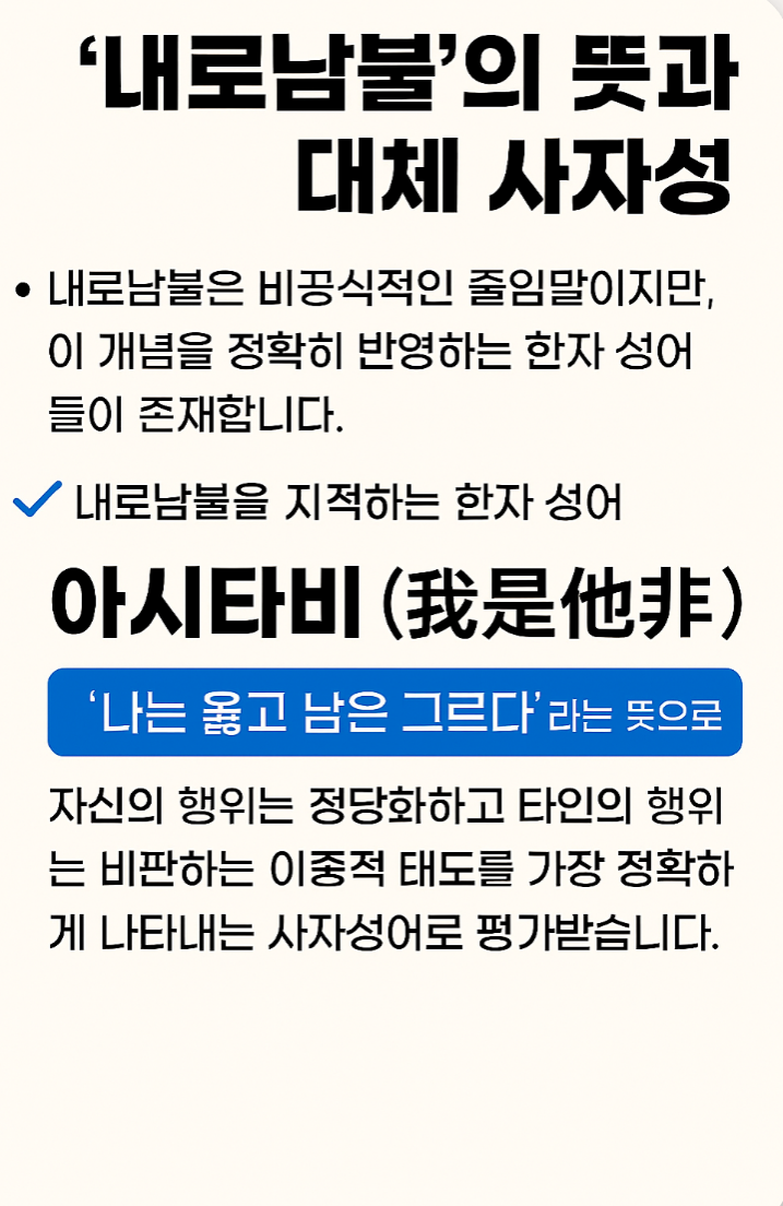 '내로남불'은 비공식적인 줄임말이지만, 이 개념을 정확히 반영하는 한자 성어들이 존재합니다.
