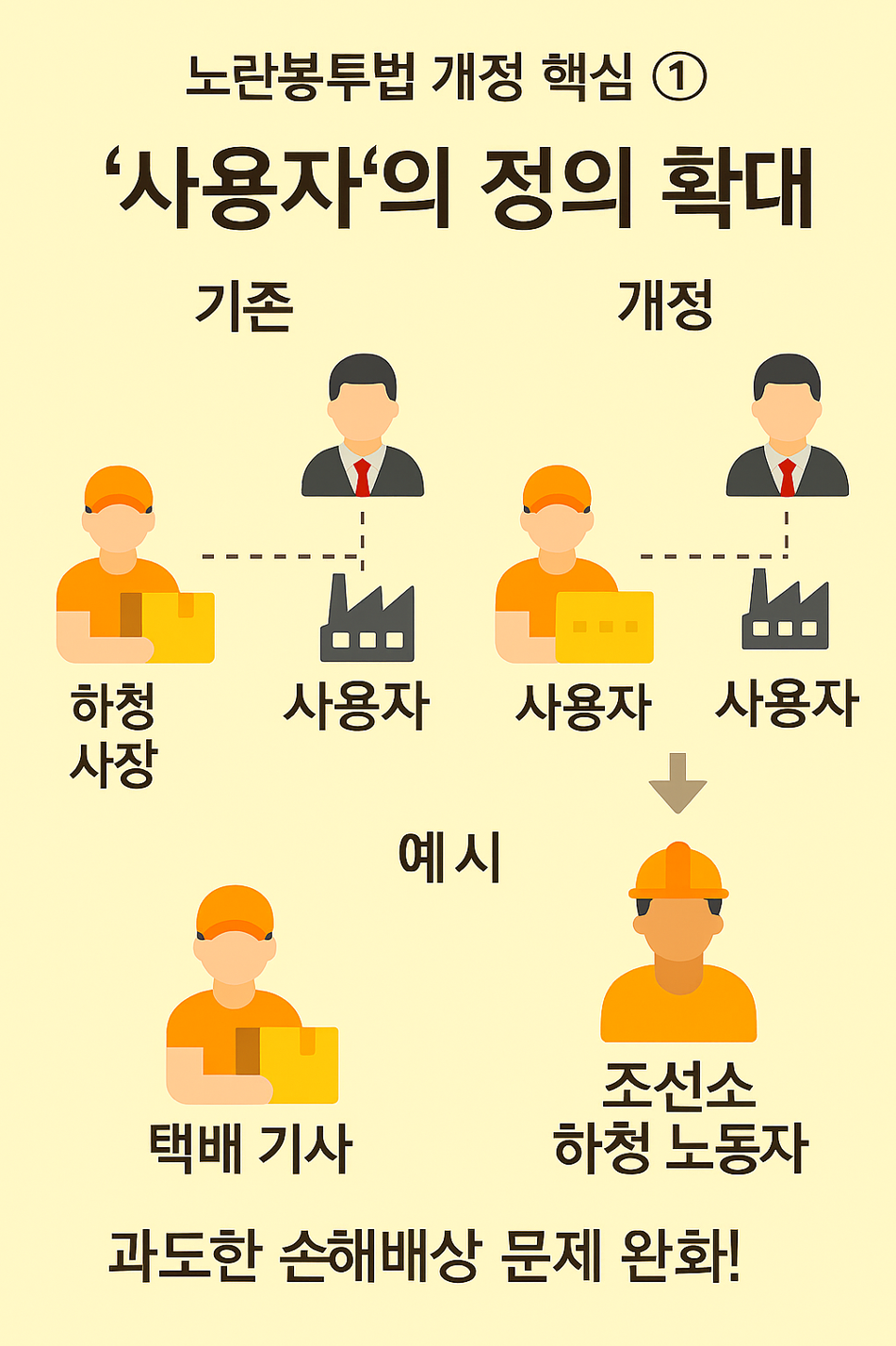 - [개정]: 근로계약을 직접 맺지 않았더라도, '근로자의 근로조건을 실질적이고 구체적으로 지배·결정할 수 있는 지위에 있는 자'(예: 원청 대기업)도 사용자로 볼 수 있게 했습니다.