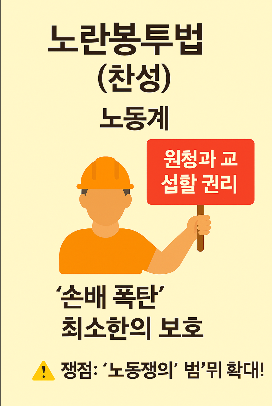- 노동계 (찬성): "하청/특수고용직 노동자도 '진짜 사장'인 원청과 교섭할 권리를 보장하고, 과도한 손배소송으로 노동 3권을 위축시키는 '손배 폭탄'을 막기 위한 최소한의 보호 장치다."