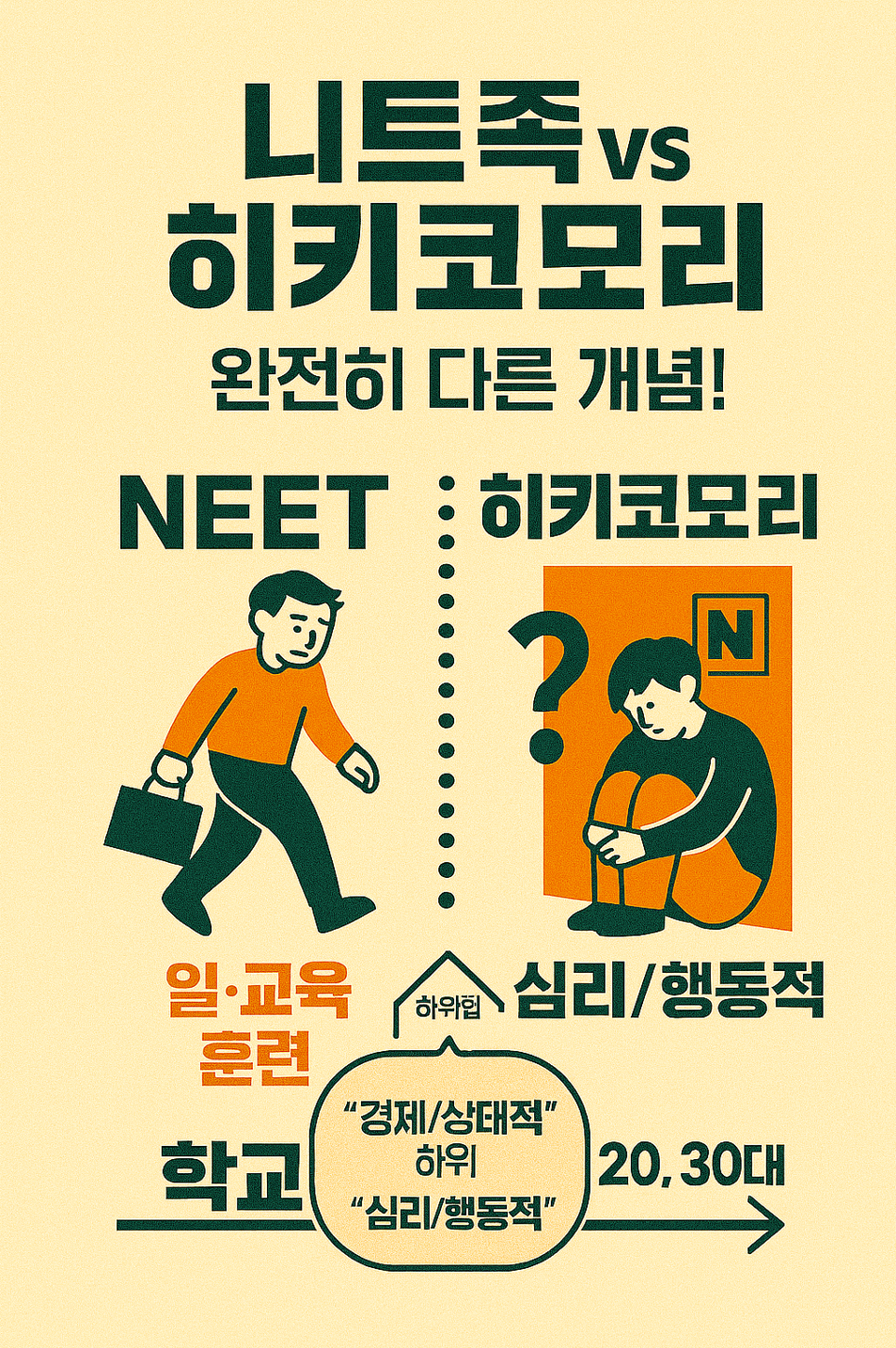 - 히키코모리 (은둔형 외톨이): 6개월 이상 집 밖으로 나오지 않고 '사회적 관계' 자체를 극단적으로 회피하는 '심리/행동적' 상태입니다. (즉, 히키코모리는 니트족에 포함되지만, 니트족이 모두 히키코모리는 아닙니다.)