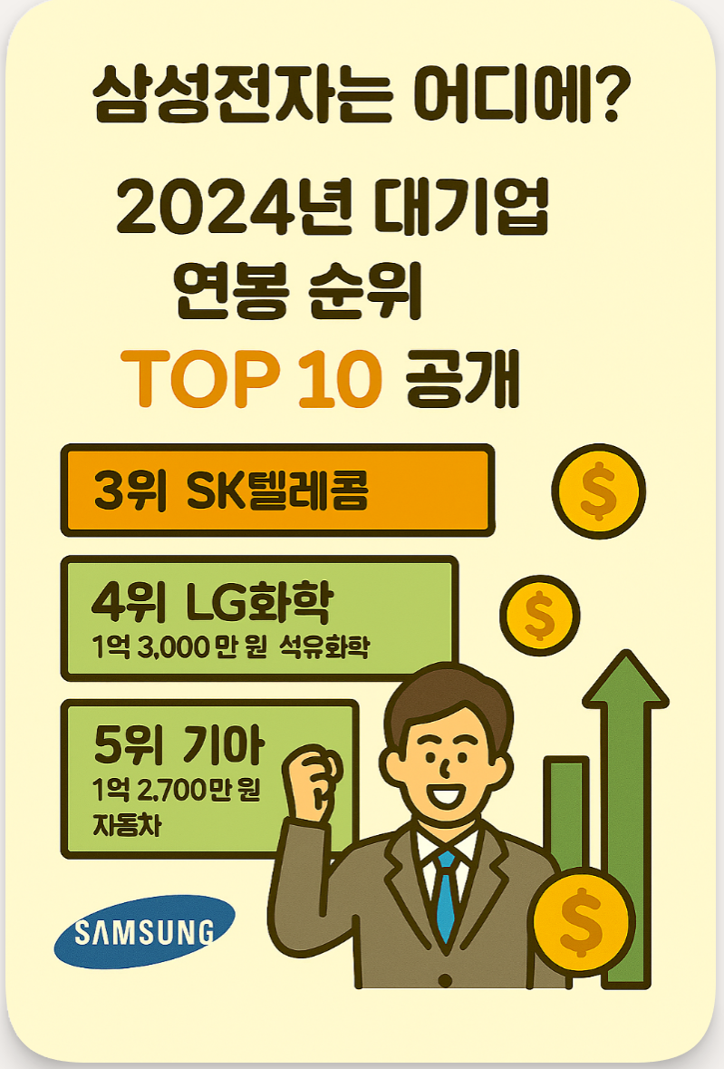"꿈의 연봉 1억 7천만 원?" 2024년 대기업 연봉 순위 TOP 10 공개! 에쓰오일, SK이노베이션 등 정유업계의 강세와 삼성전자의 숨 고르기, 그리고 현대차의 약진까지. 부러움 주의! 대한민국 직장인 연봉 서열을 정리해 드립니다.