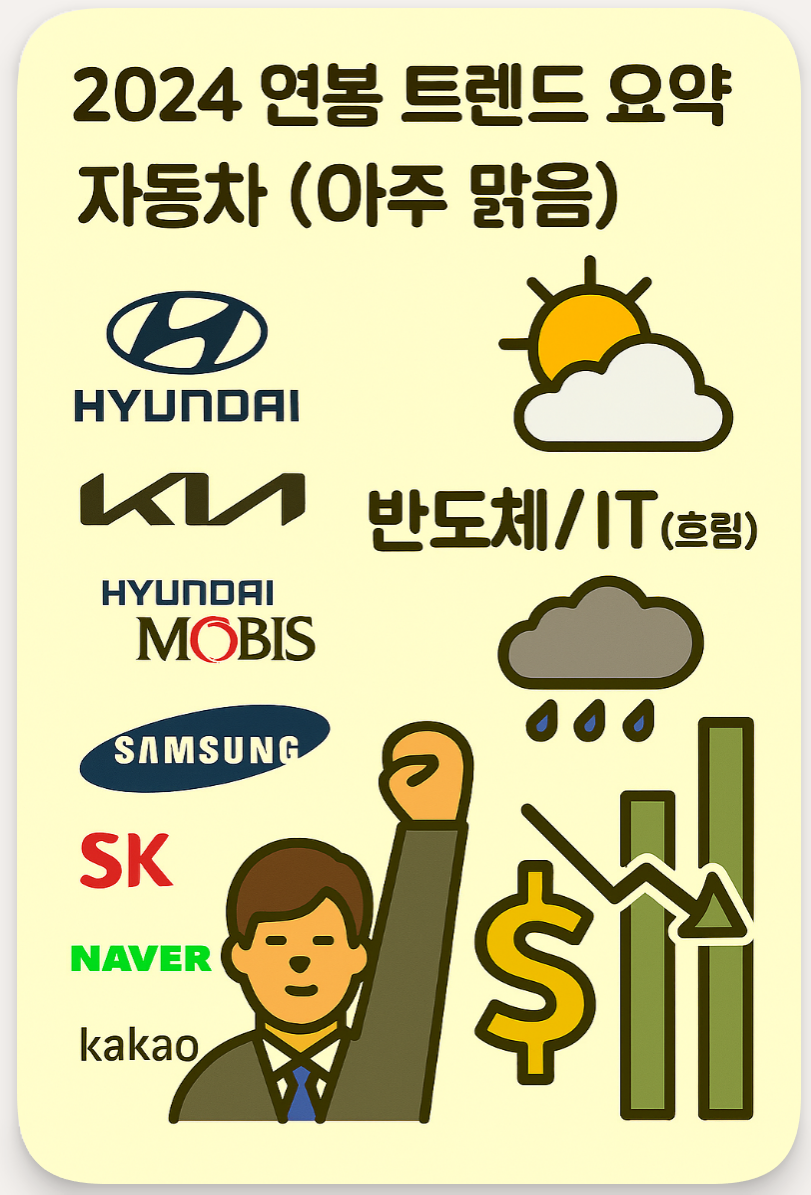 - 반도체/IT (흐림): 삼성전자, SK하이닉스, 네이버, 카카오 등은 경기 침체와 실적 둔화로 인해 연봉 상승폭이 제한적이거나 감소했습니다.