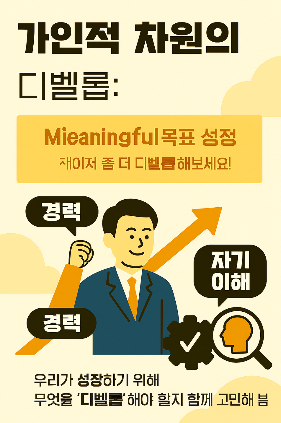 - 역량 디벨롭 (Skill Development): 직무 전문성, 외국어 능력, 커뮤니케이션 스킬, 문제 해결 능력 등 업무나 일상생활에 필요한 구체적인 기술과 능력을 배우고 향상시키는 것입니다. 꾸준한 학습과 연습이 중요하죠.