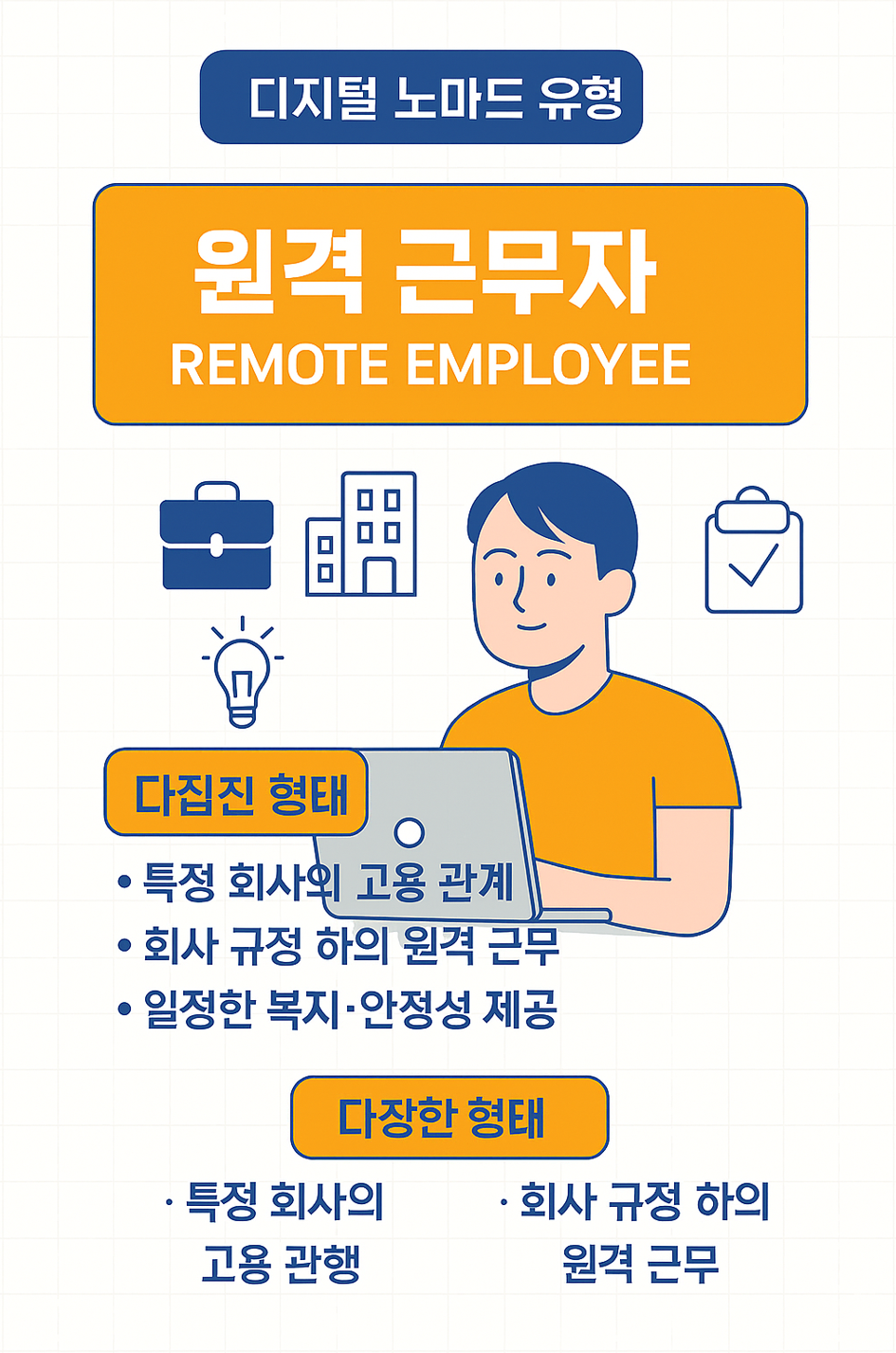 특정 회사에 정규직 또는 계약직으로 소속되어 있지만, 사무실로 출근하지 않고 집이나 원하는 장소에서 원격으로 근무하는 직원입니다. 고용 안정성과 회사 복지 혜택을 누리면서 비교적 자유롭게 일할 수 있다는 장점이 있습니다. 다만, 회사의 규정에 따라 근무 시간이나 장소에 제약이 있을 수 있습니다.