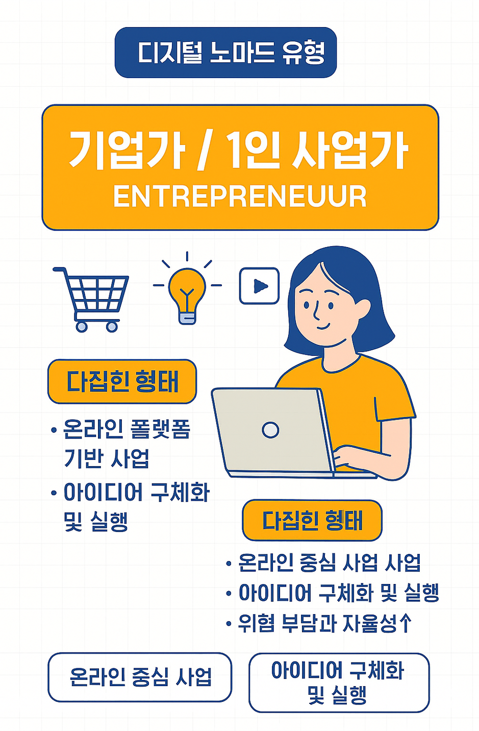 자신만의 온라인 기반 사업을 운영하는 디지털 노마드입니다. 온라인 쇼핑몰 운영, 디지털 콘텐츠(유튜브, 블로그 등) 제작, 온라인 강의 플랫폼 운영, 소프트웨어/앱 개발 판매 등 다양한 형태가 있습니다. 사업 아이템 선정부터 운영까지 모든 것을 책임져야 하지만, 성공 시 높은 수입과 완전한 자율성을 누릴 수 있습니다.