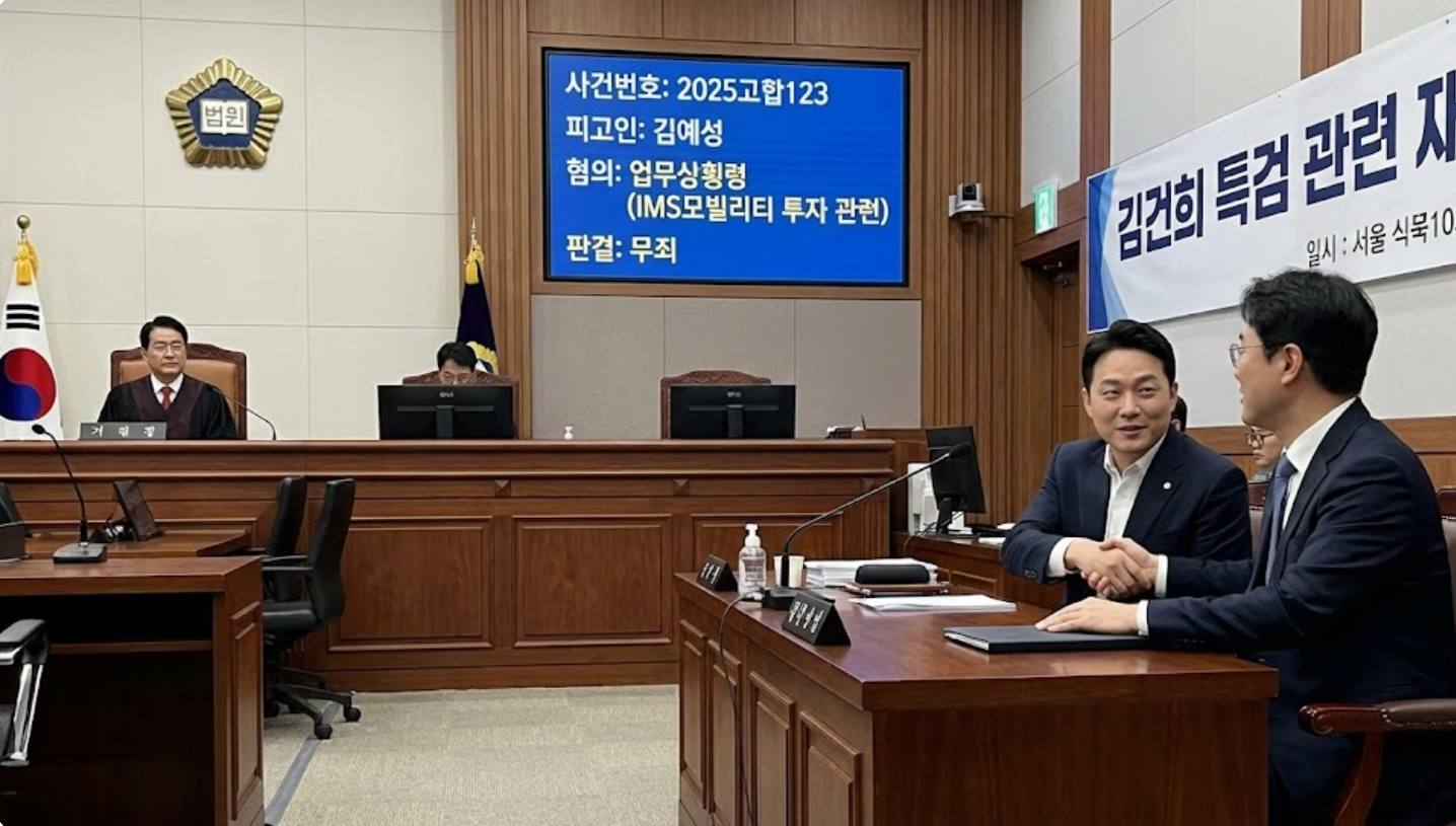 하지만 재판부의 시선은 달랐습니다. 특검의 주장대로 횡령으로 보더라도, 김예성 씨의 회사가 투자 성사로 IMS모빌리티 주식 46억 원어치를 매각하여 상당한 이익을 거두었다는 점에 주목했습니다. 이는 단순한 횡령으로 보기 어렵다는 판단의 근거가 되었습니다. 재판부는 이 역시 '범죄의 증명이 없다'고 판단하며 무죄를 선고했습니다.