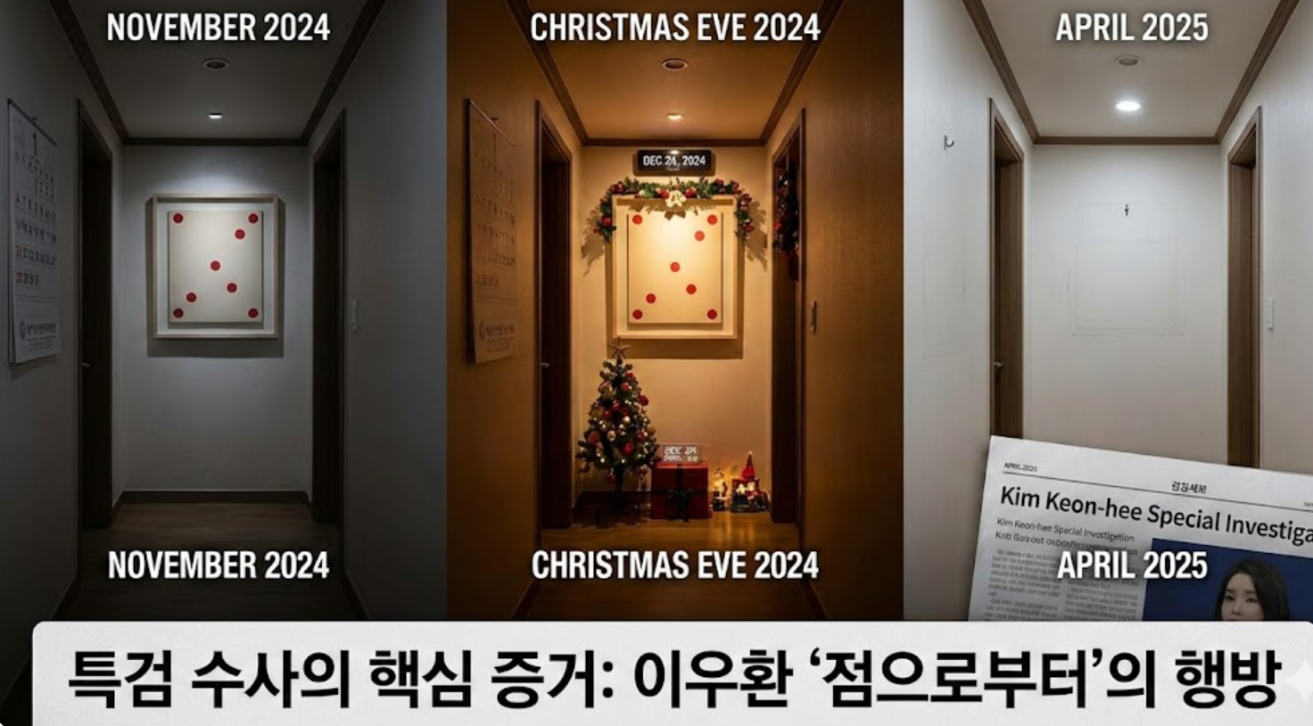 사건의 중심에는 이우환 화백의 유명한 '점으로부터' 연작 액자가 있습니다. 2024년 11월, 그리고 같은 해 성탄절 이브, 이듬해인 2025년 4월까지 김건희 씨의 오빠 김진우 씨 자택 복도 끝에 걸려 있던 이 액자가 김건희 특검 수사의 도마 위에 올랐습니다. 특검은 김상민 전 부장검사의 청탁금지법 혐의 재판에서, 김 전 검사가 이 그림을 구입한 후 김진우 씨를 통해 2023년 2월경 김건희 씨에게 전달했다고 지목했습니다.