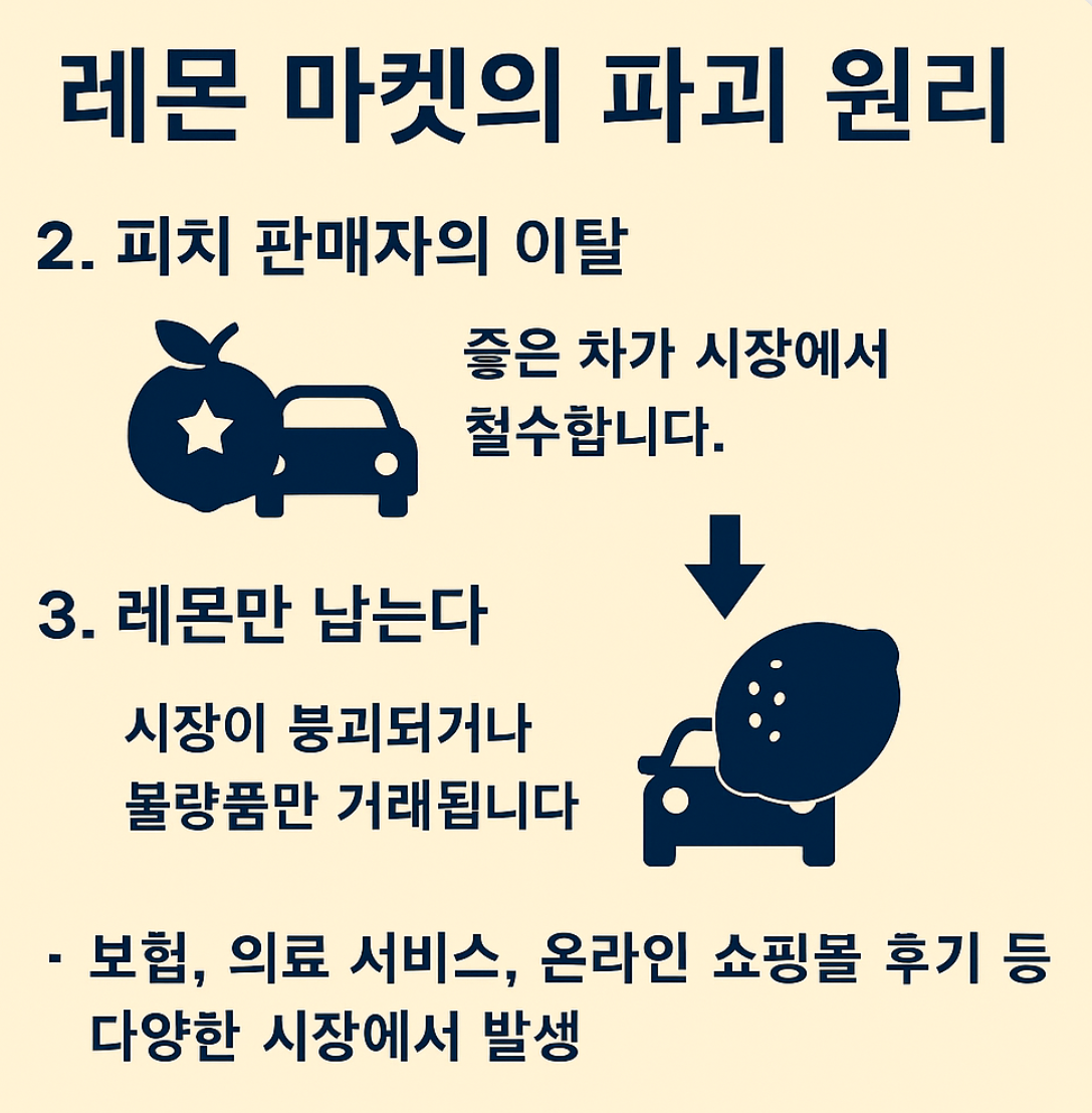 - 3. 레몬만 남는다: 시장에는 레몬(불량품)만 남게 되고, 결국 소비자는 더욱 불신하게 됩니다. → 시장 자체가 붕괴되거나 불량품만 거래됩니다.