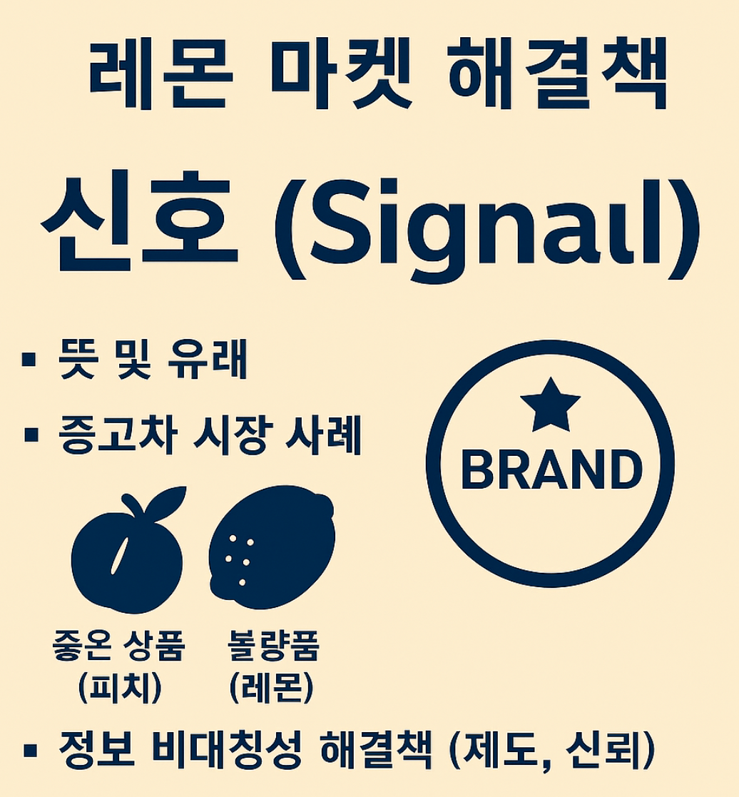 - 신호 (Signal): 품질이 좋은 판매자(피치)가 자발적으로 자신의 품질을 입증하는 행위. (예: 유명 브랜드, 무상 A/S 기간 보장, 공식 인증 중고차 제도)