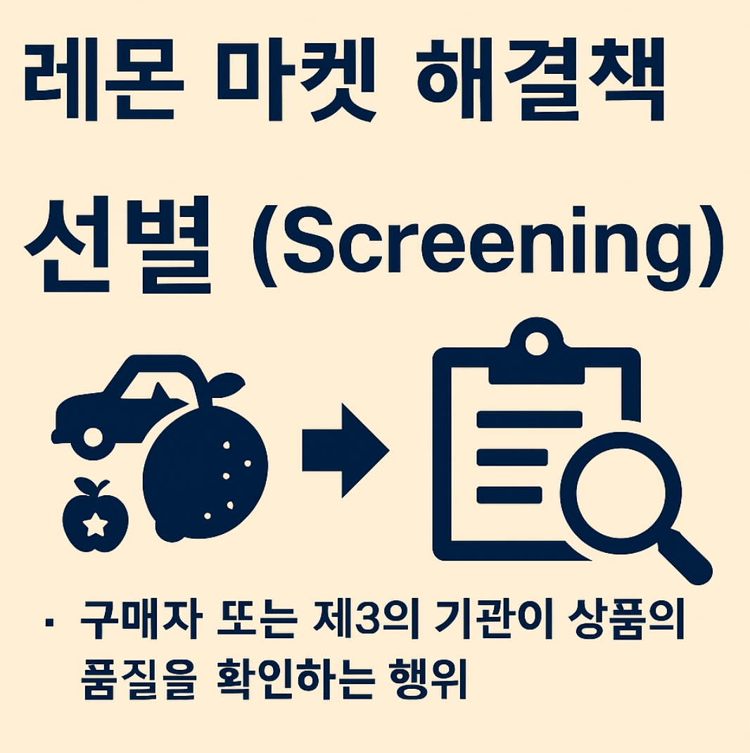 - 선별 (Screening): 구매자나 제3의 기관이 상품의 품질을 확인하는 행위. (예: 공인된 감정사 평가, 보험 가입 전 건강검진 요구, 제3자 성능 기록부 공개)