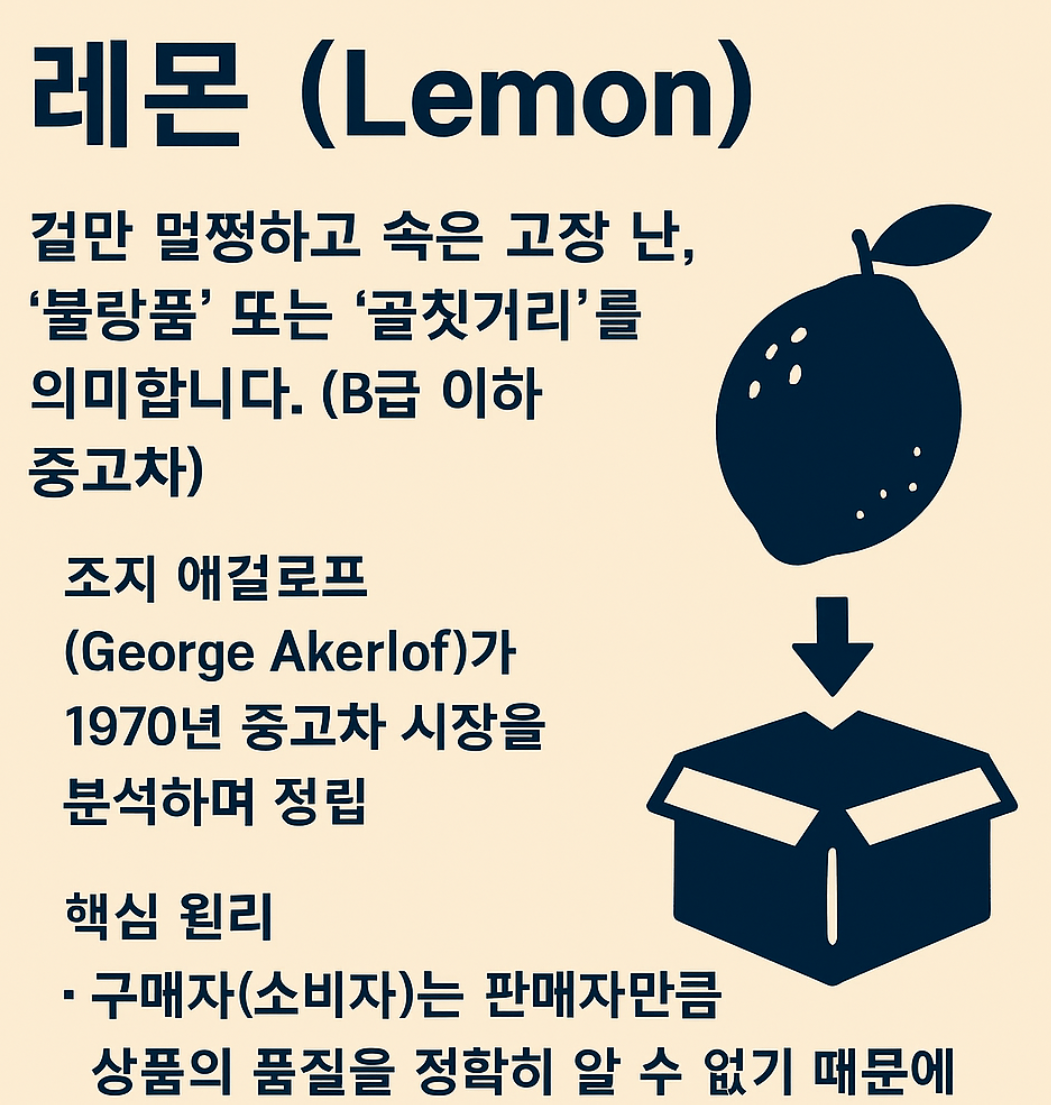 이 개념은 1970년 경제학자 조지 애컬로프(George Akerlof)가 중고차 시장을 분석하며 정립했습니다.