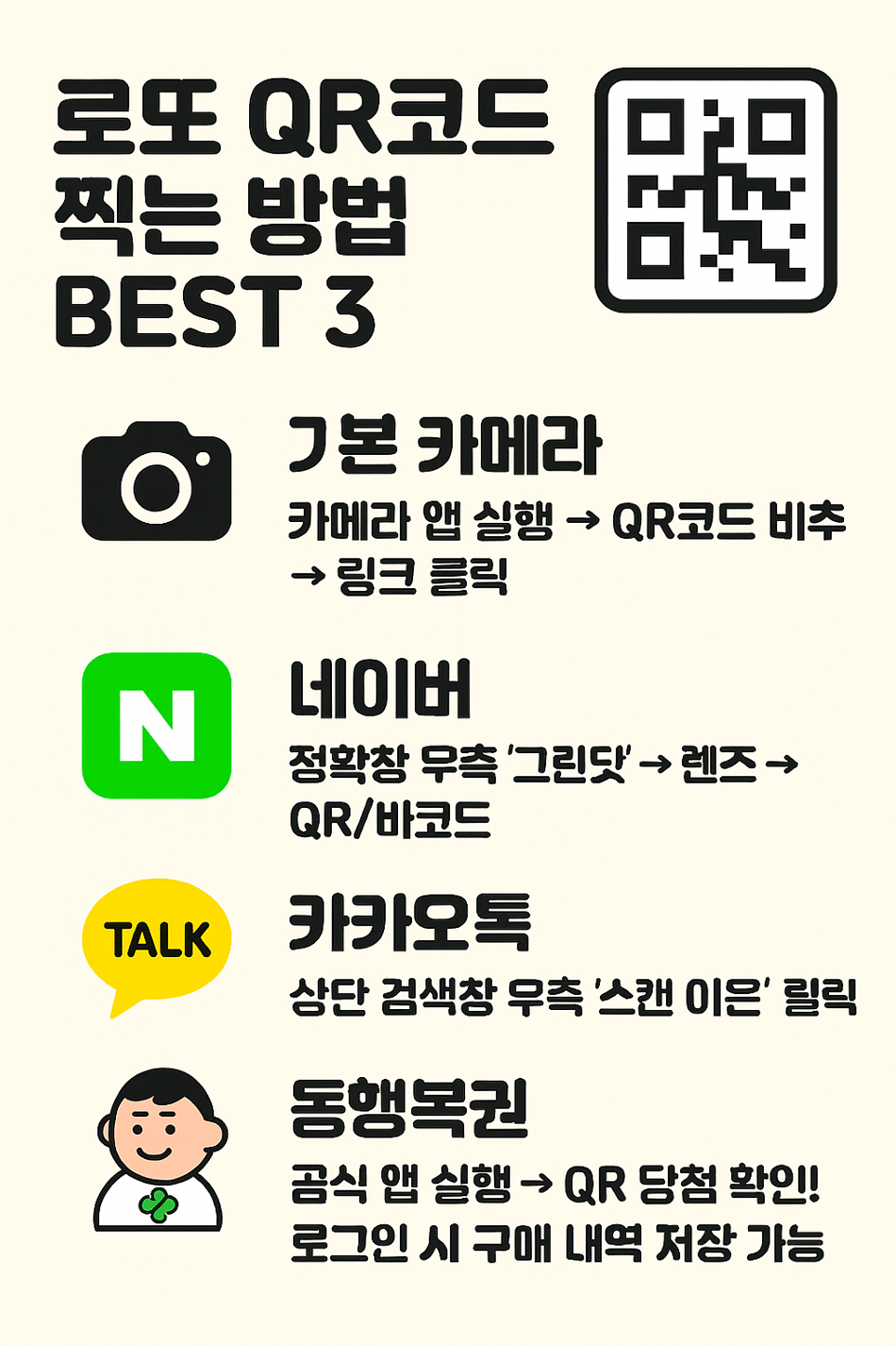 | 동행복권 앱 | 공식 앱 실행 → QR 당첨 확인 | 로그인 시 구매 내역 저장 가능 |