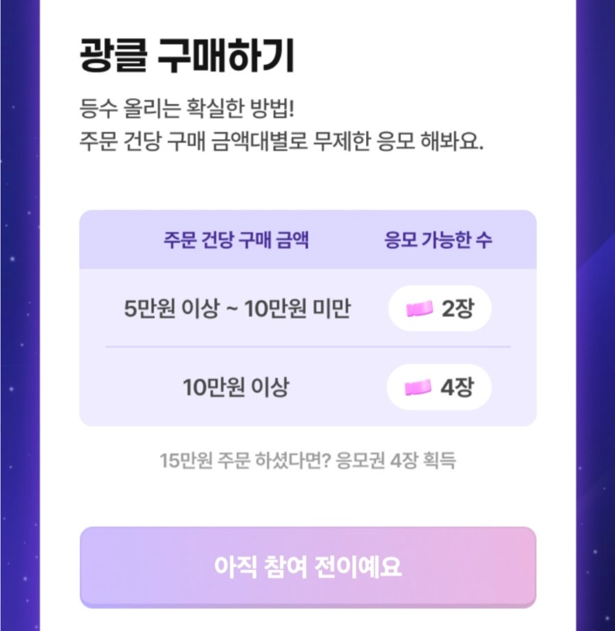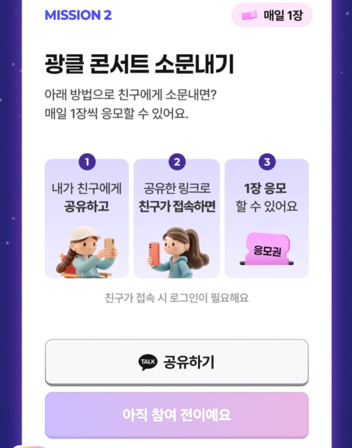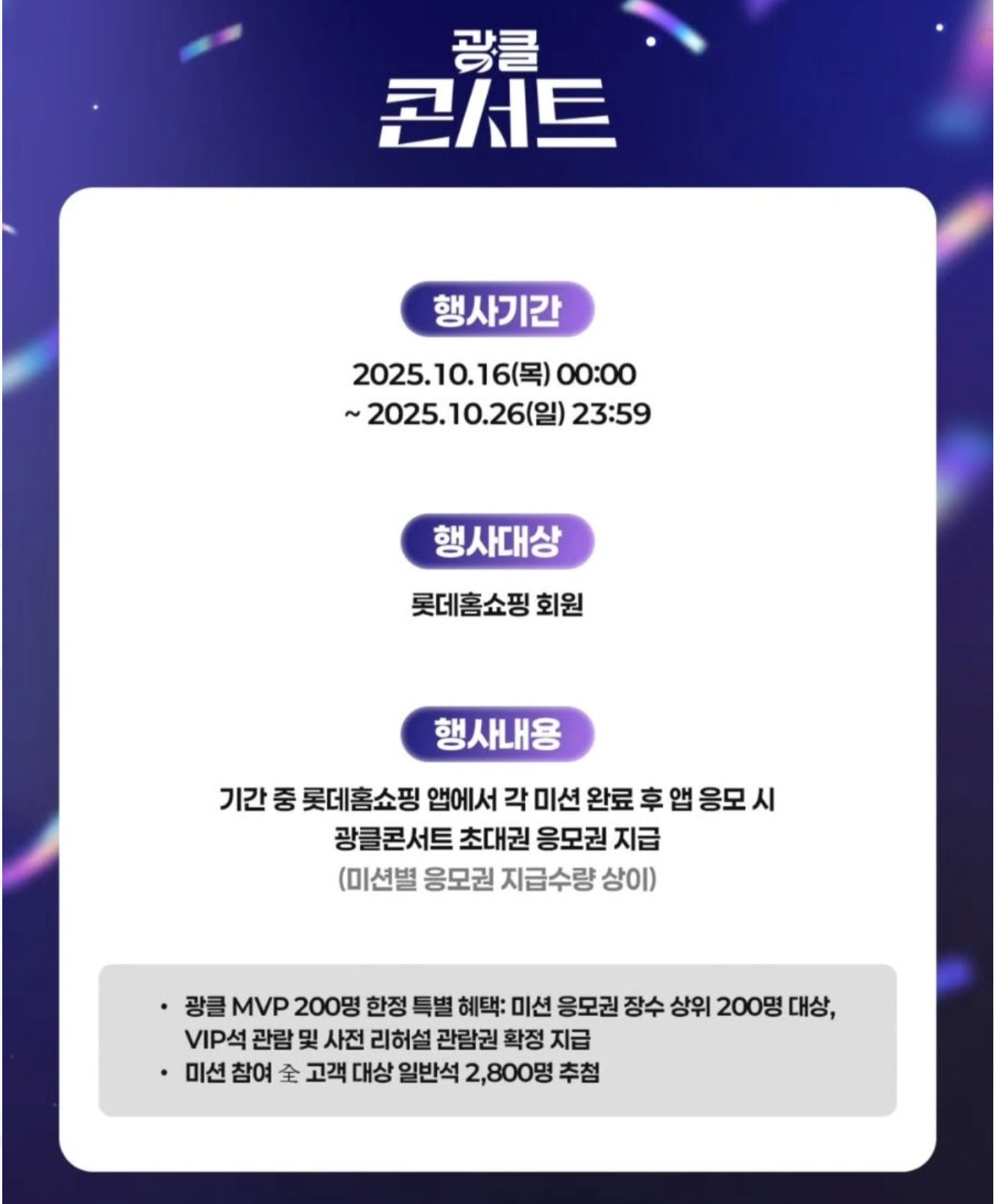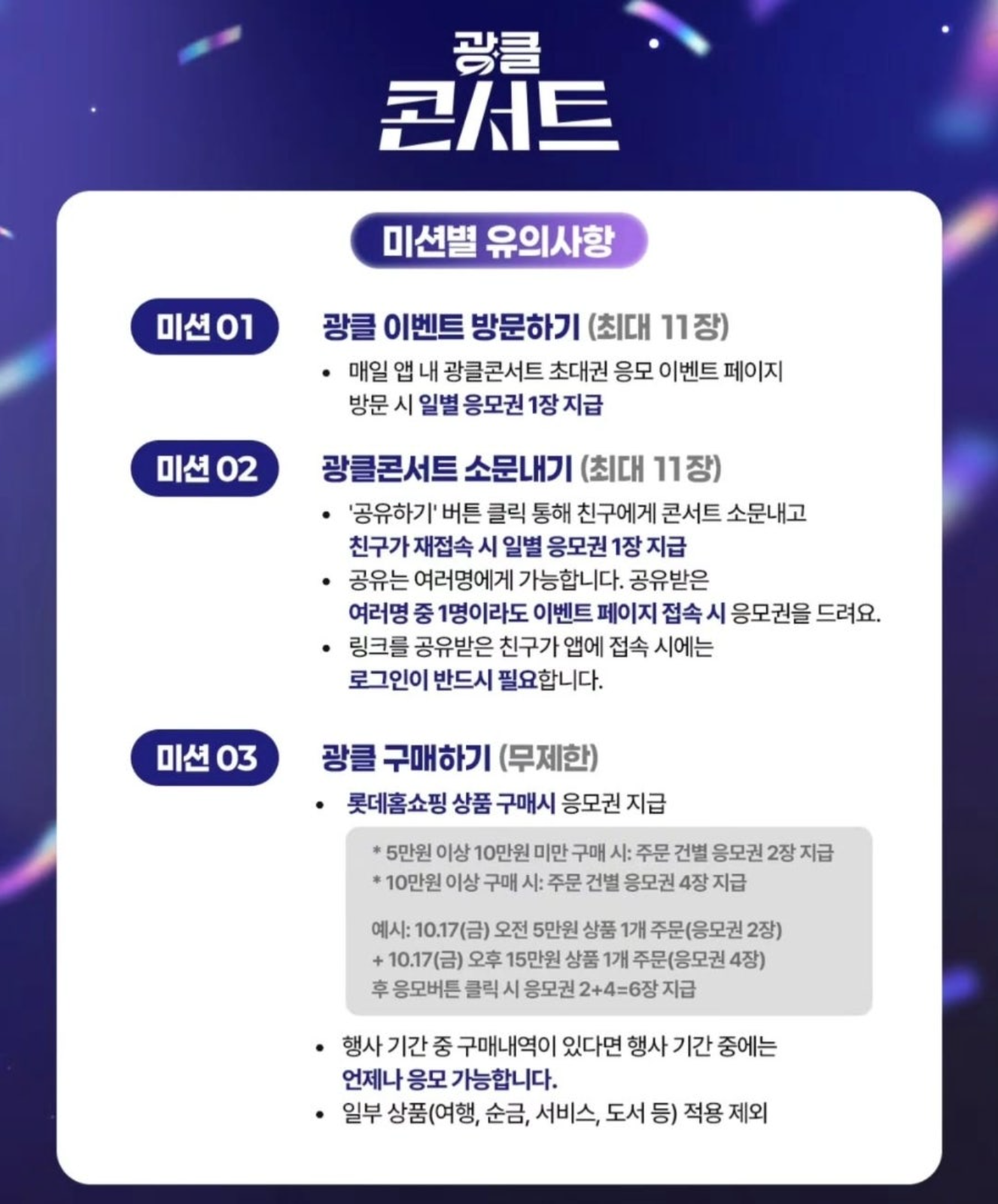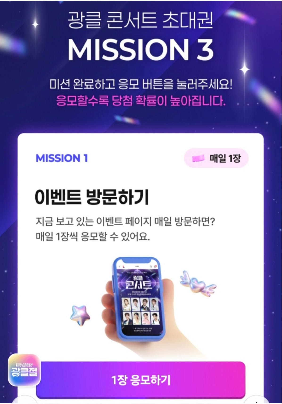 - 앱 접속 및 이벤트 참여 시 '광클콘서트' 응모권 증정