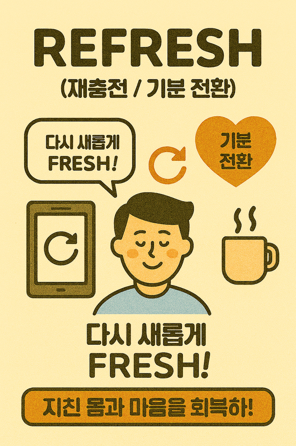 '리프레쉬(Refresh)'는 '다시(Re)'와 '신선한(Fresh)'이 합쳐진 영어 단어입니다. 말 그대로 '다시 신선하게 만들다'라는 뜻이 기본 핵심입니다.