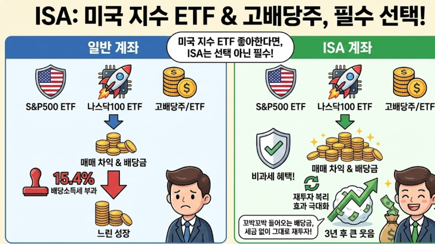 미국 주식 지수를 추종하는 ETF(예: S&P500, 나스닥100 등)를 좋아하신다면 ISA는 선택이 아닌 필수입니다. 일반 계좌에서 국내 상장 해외 ETF를 매매하면 매매 차익에 대해 15.4%의 배당소득세를 내야 하지만, ISA에서는 비과세 혜택을 온전히 누릴 수 있기 때문입니다.