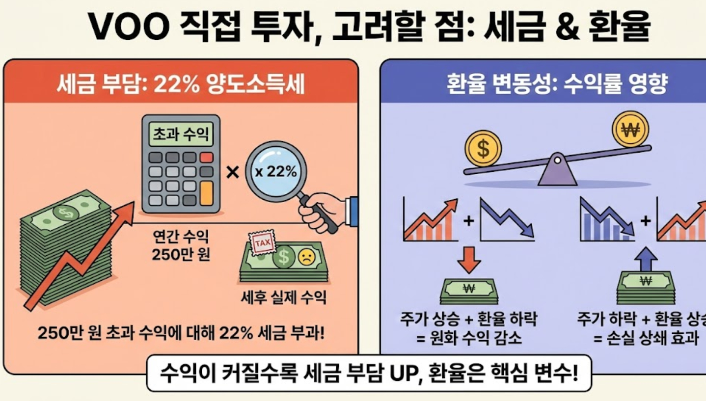 결국 VOO 직접 투자는 장기적인 저렴한 비용과 달러 자산을 보유한다는 매력이 크지만, 양도소득세와 환전의 번거로움이라는 명확한 단점도 있습니다.
