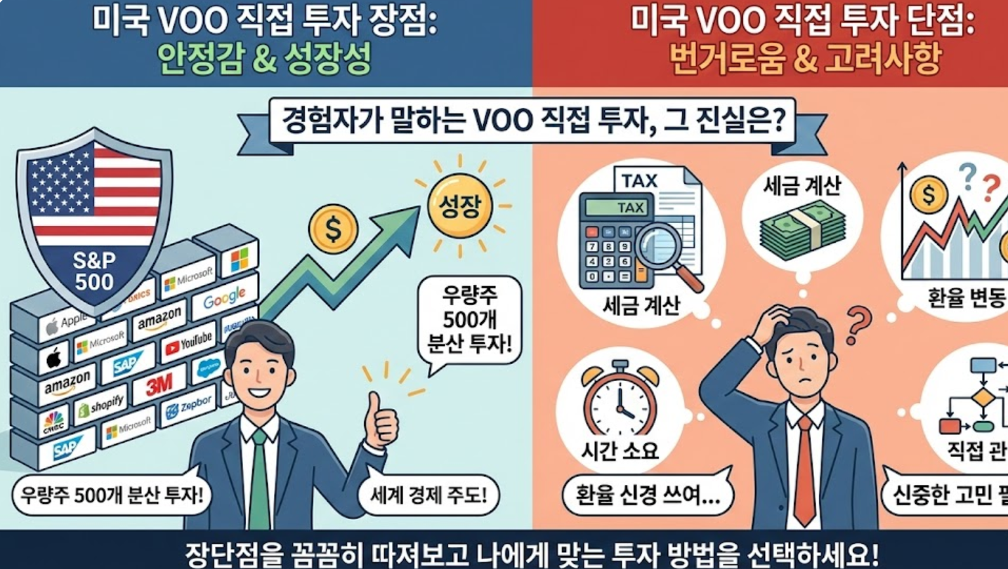 요즘 주변을 보면 너도나도 미국 주식, 그중에서도 VOO 투자를 시작했다는 분들이 정말 많네요. 저 역시 천조국이라 불리는 미국의 성장성에 올라타고자 VOO 직접 투자를 경험해 봤는데요. 역시 세계 경제를 주도하는 우량주 500개에 분산 투자한다는 안정감은 정말 대단하더라고요. 하지만 직접 투자를 해보니 수익률 뒤에 숨겨진 세금 계산이나 환율 변동 같은 번거로운 점들도 분명히 존재했습니다. 오늘은 VOO 직접 투자를 고민하시는 분들을 위해 제가 느낀 장단점을 가감 없이 알려드릴게요!