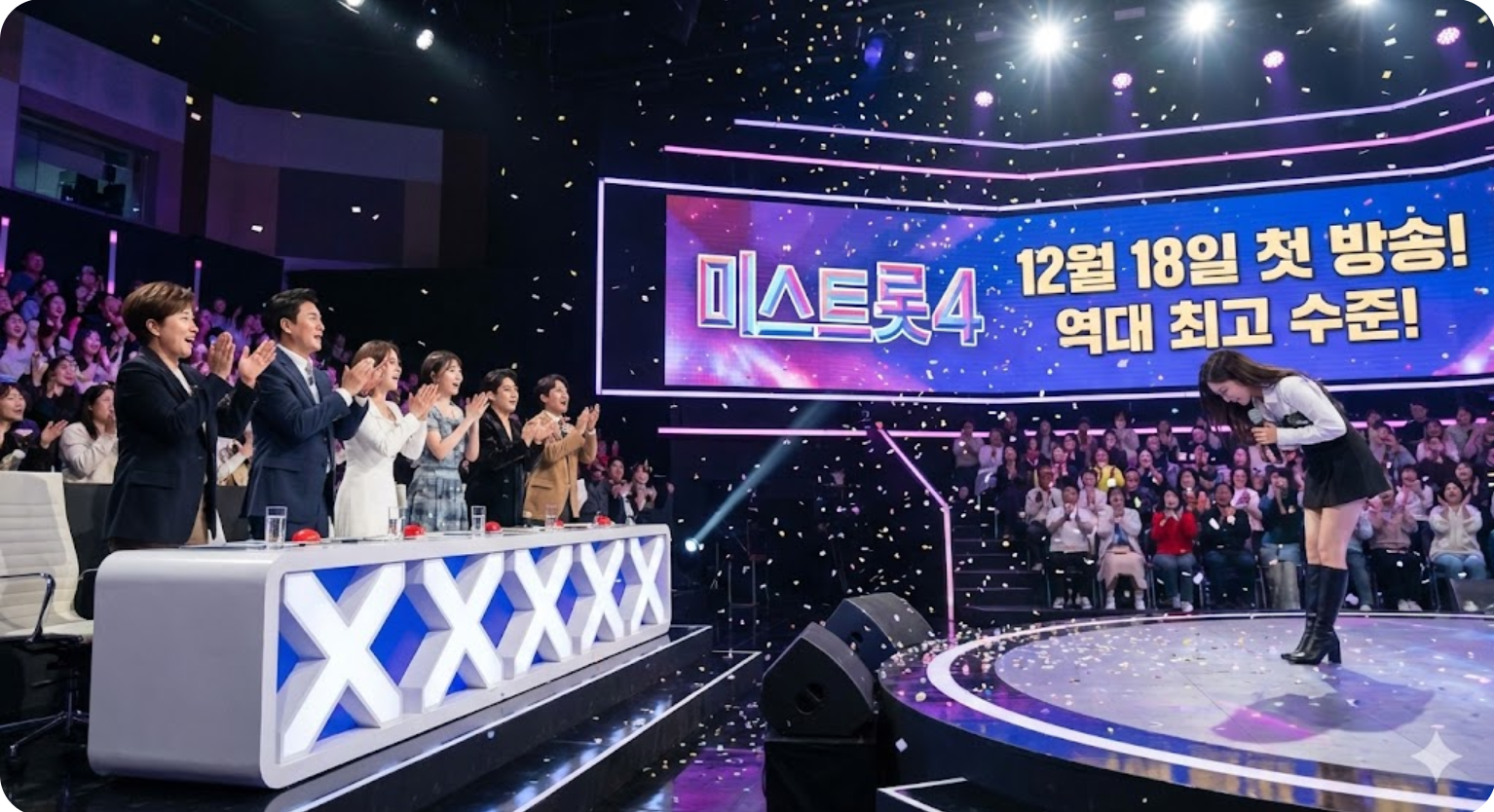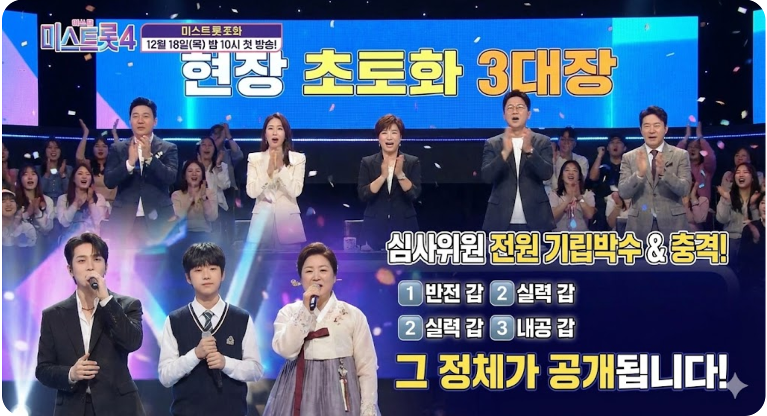 오는 12월 18일 첫 방송되는 '미스트롯4'가 시작 전부터 심상치 않습니다. 첫 녹화 현장에서 심사위원들이 심사를 잊고 기립박수를 칠 정도로 압도적인 실력자가 나타났다는 후문이 들려오고 있는데요.