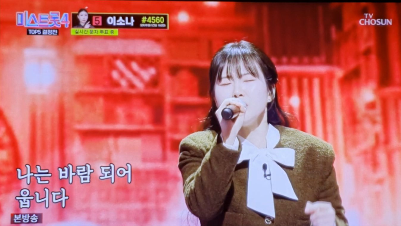 사랑과 이별에 대한 근원적인 질문을 던지는 곡의 메시지를 홍성윤은 국악 전공자 특유의 깊이 있는 감성으로 완벽하게 재해석했습니다. 단순한 트로트 창법을 넘어, 곡이 가진 슬픔과 애절함을 더욱 풍부하게 표현해냈습니다. 특히 "돌아서는 그대 마지막 눈물에 바람이 되겠다는" 애절한 가사를 그녀만의 맑고 청량한 보이스로 완벽하게 소화해내며 감탄을 자아냈고, 저는 그 순간 그녀의 목소리에 완전히 몰입할 수밖에 없었습니다. 이 무대는 그녀가 가진 폭넓은 스펙트럼과 음악적 깊이를 여실히 보여준 증거였습니다.