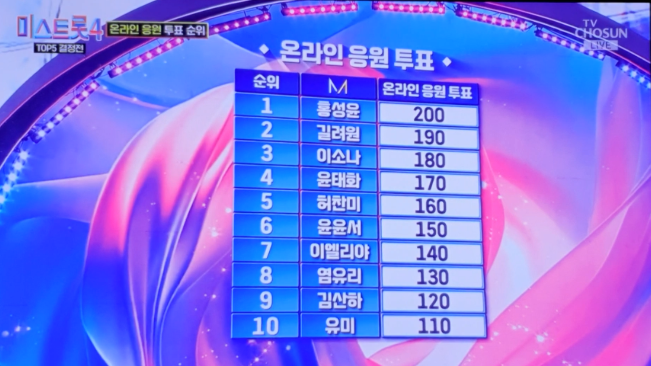 온라인 응원 투표는 1위에게 200점을 부여하고, 2위부터 10위까지는 10점씩 차등 배점하는 방식으로 진행되었습니다. 1위 홍성윤 참가자와 10위 유미 참가자의 점수 차이가 무려 90점이나 벌어지는 것을 보면, 온라인 팬덤의 지지가 얼마나 중요한지 다시 한번 느낄 수 있습니다.