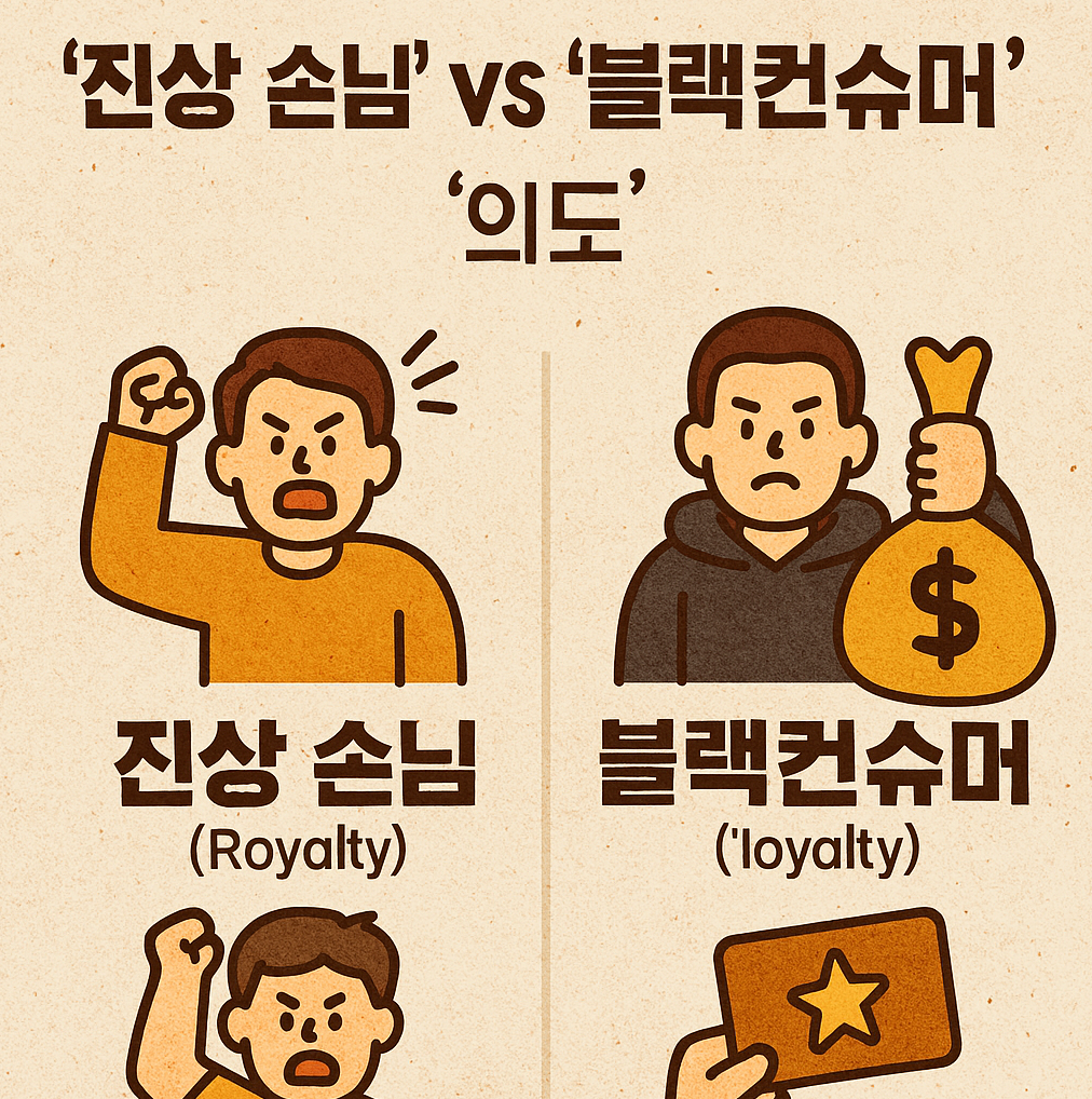 - 블랙컨슈머: 처음부터 '돈'이나 '보상'을 목적으로 의도적으로 접근하며, 협박과 거짓말을 도구로 사용합니다. (악의적인 범죄에 가까움)