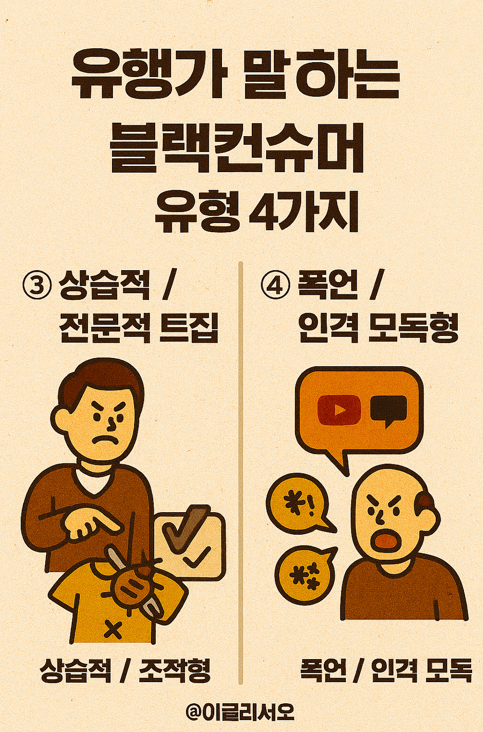 | ④ 폭언 / 인격 모독형 | 제품과 상관없이 감정 쓰레기통처럼 직원에게 폭언, 욕설, 성희롱 등 인격 모독적인 발언을 쏟아내며 스트레스를 풉니다. (예: "너 대학 어디 나왔어?", "부모님이 그렇게 가르쳤냐?") |