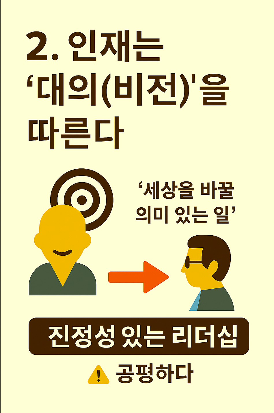 유비가 세 번의 방문 끝에 제갈량을 만나 '천하삼분지계'를 논했듯, 인재는 그 회사가 가진 '비전'과 '대의'를 봅니다. 단순히 월급을 많이 주는 회사가 아니라, '이 리더와 함께라면 세상을 바꿀 만한 의미 있는 일을 할 수 있겠다'는 확신이 들어야 마음이 움직입니다. 이런 비전을 제시하고 공감을 얻는 것은 매우 어려운 일입니다.