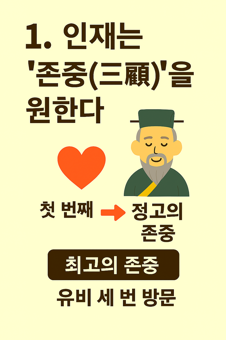 뛰어난 인재는 돈(연봉)만 보고 움직이지 않습니다. 그들은 자신의 능력을 인정해주고, 합당한 예우와 존중을 보여주는 리더를 원합니다. 유비가 한낱 장수도 아닌 황숙(皇叔)의 신분으로 두 번이나 거절당하고도 세 번이나 초가집을 찾아간 행위(三顧) 자체가 제갈량에게는 최고의 '존중'의 표시였습니다.