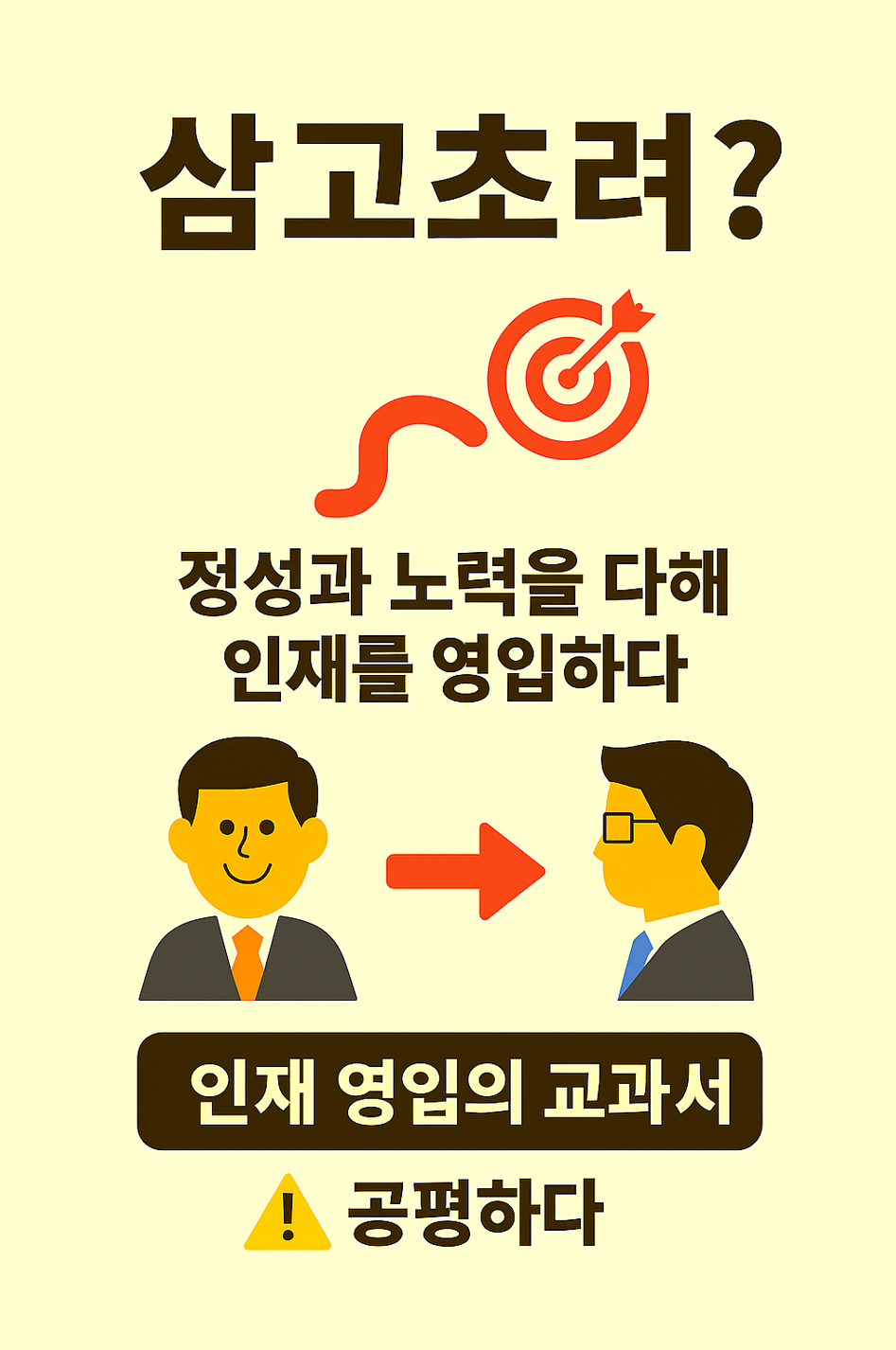 유비는 실무자(HR팀)를 보낸 것이 아니라, 리더인 자신이 직접 갔습니다. 이는 인재 영입은 단순한 '채용 기술(스킬)'이 아니라, 리더의 '진심 어린 태도'와 '간절함'이 필요한 영역임을 보여줍니다.