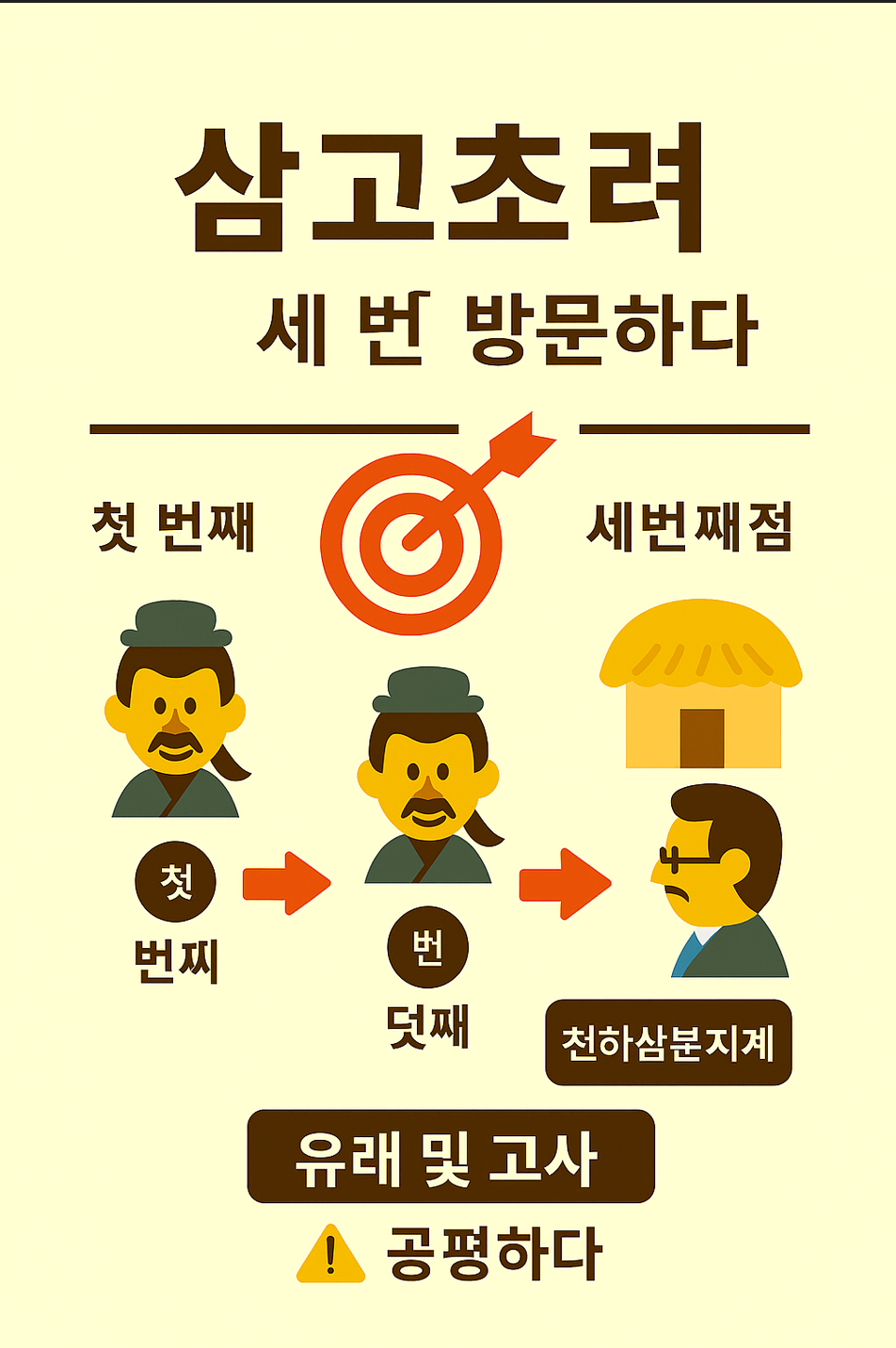 즉, '초가집을 세 번 방문한다'는 뜻입니다. 이 말은 유명한 '삼국지연의'에서 유비가 제갈량(제갈공명)을 얻기 위해 그의 초가집을 세 번이나 찾아간 고사에서 유래했습니다.