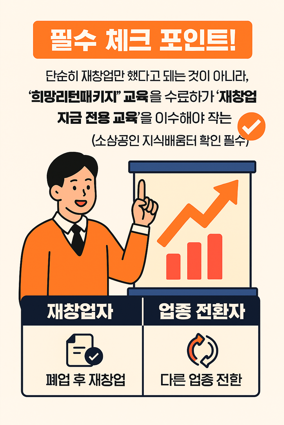 단순히 재창업만 했다고 되는 것이 아니라, '희망리턴패키지' 교육을 수료하거나 '재창업 자금 전용 교육'을 이수해야 신청 자격이 주어지는 경우가 많습니다. (소상공인 지식배움터 확인 필수)