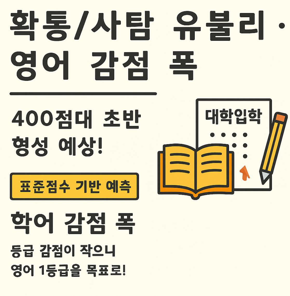 - 영어 감점 폭: 연세대처럼 등급에 따른 감점 폭이 크지 않아, 영어 1등급을 받았다면 국/수/탐 점수 확보에 집중해야 합니다.