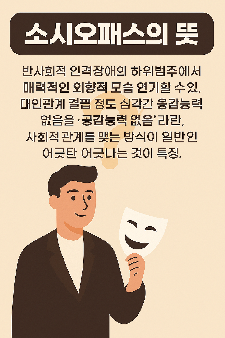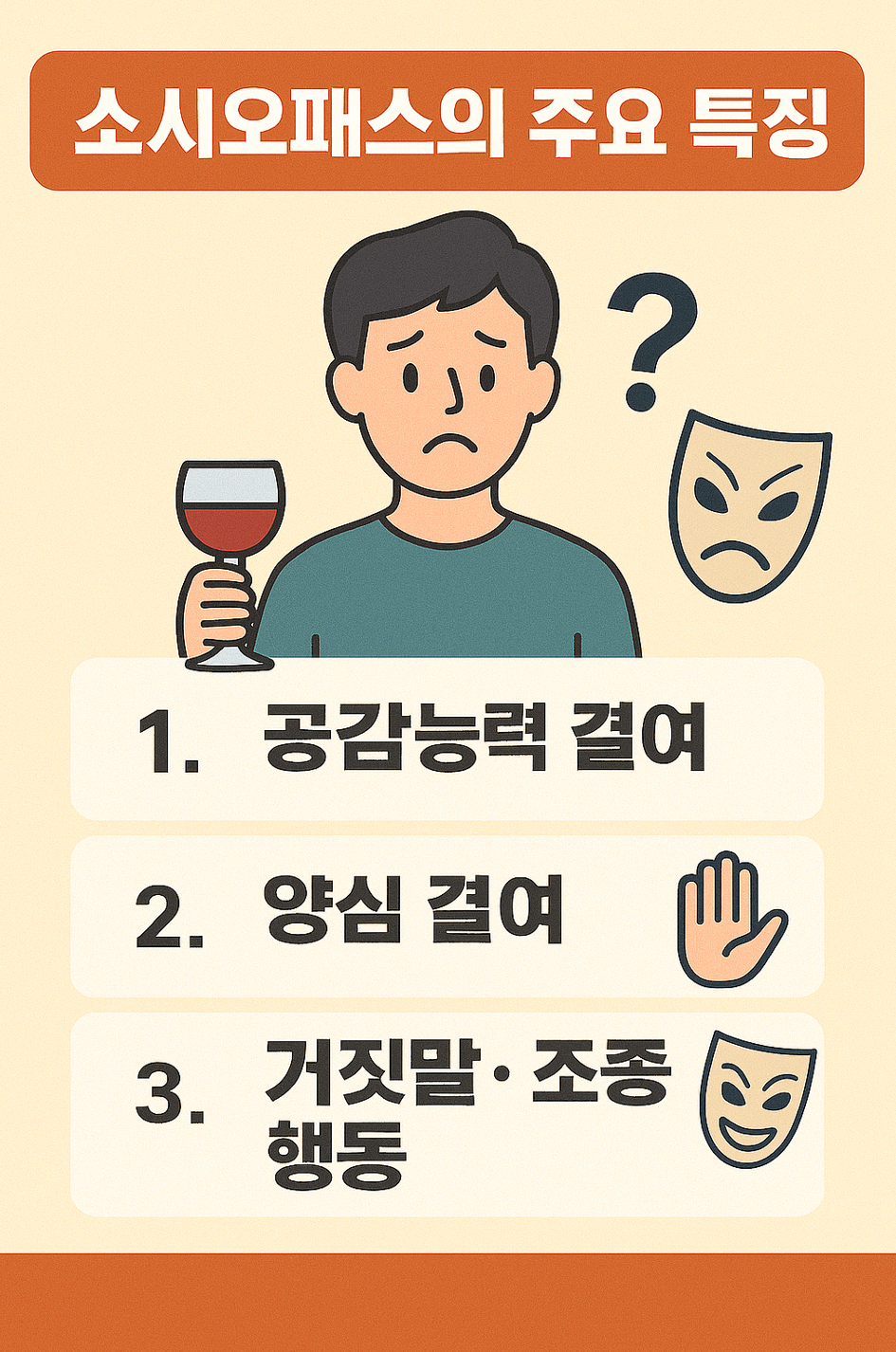| 1. 공감 능력의 결여 | 타인의 감정을 이해하거나 느끼지 못합니다. 슬픈 사람 앞에서 슬픈 척 '연기'는 할 수 있지만, 진심으로 공감하지 못합니다. |