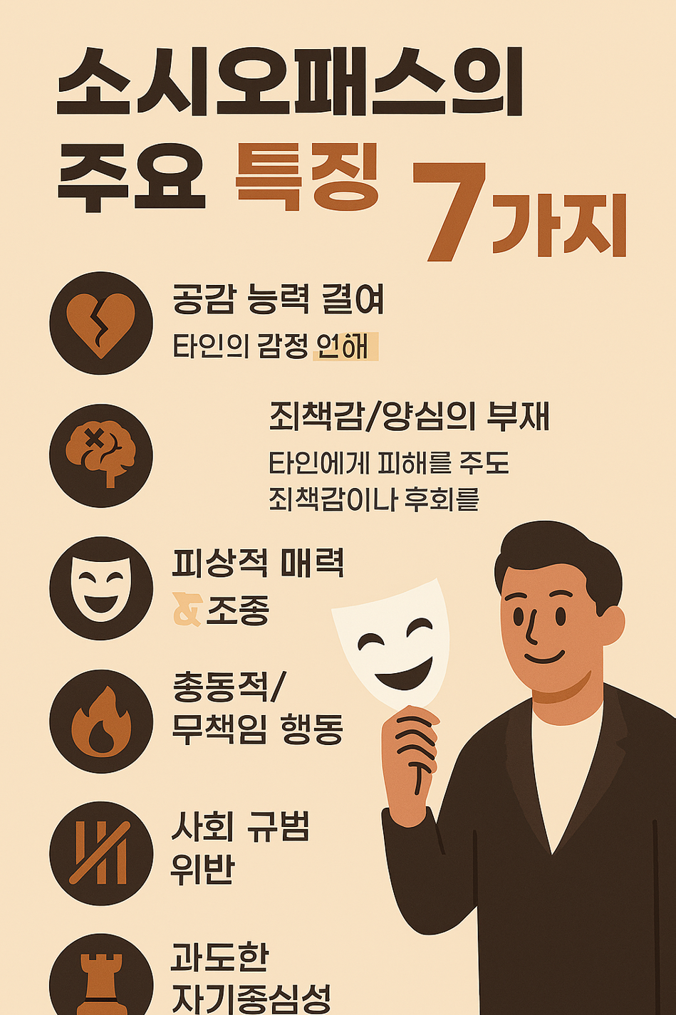 | 7. 과도한 자기중심성 | 세상이 자신을 중심으로 돌아간다고 믿으며, 타인을 자신의 목표를 위한 '도구'로만 생각합니다. |