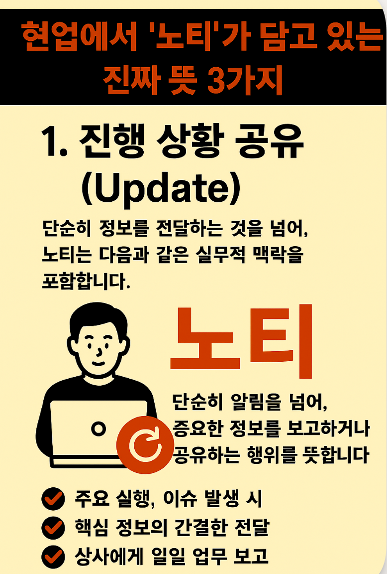 노티는 단순히 정보를 전달하는 행위가 아니라, 함께 일하는 사람들의 마음을 편하게 해주는 배려입니다.