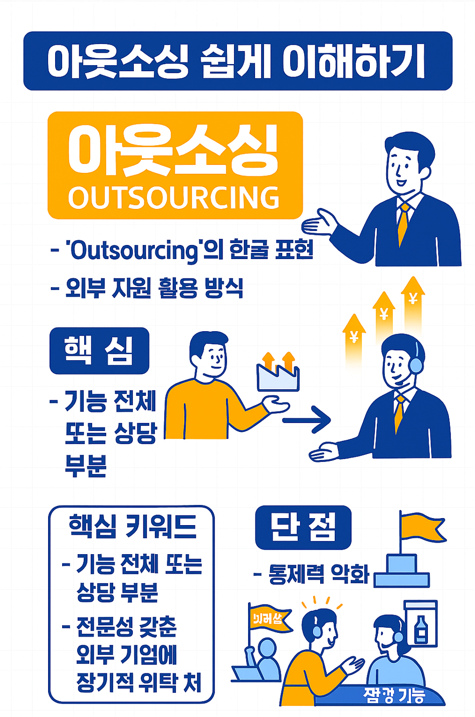 성공적인 아웃소싱을 위해서는 무엇이 우리의 핵심 업무이고 무엇을 맡겨도 되는지 명확히 판단하고, 신뢰할 수 있는 파트너(업체)를 선정하며, 지속적인 관리와 소통을 통해 품질을 유지하는 것이 무엇보다 중요합니다. 이제 아웃소싱, 확실히 이해되셨죠?