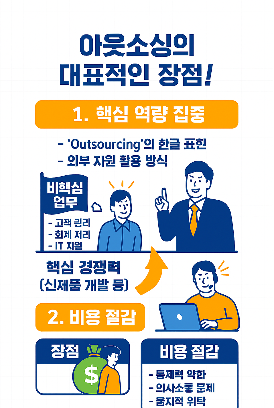기업이 가장 잘하는 일, 즉 핵심 역량(예: 신제품 개발, 마케팅 전략)에 모든 자원(인력, 시간, 비용)을 집중할 수 있습니다. 고객 관리, 회계 처리, IT 지원 등 중요하지만 비핵심적인 업무는 외부 전문가에게 맡기고, 회사의 성장을 이끄는 본질적인 업무에만 집중하는 것이죠.
