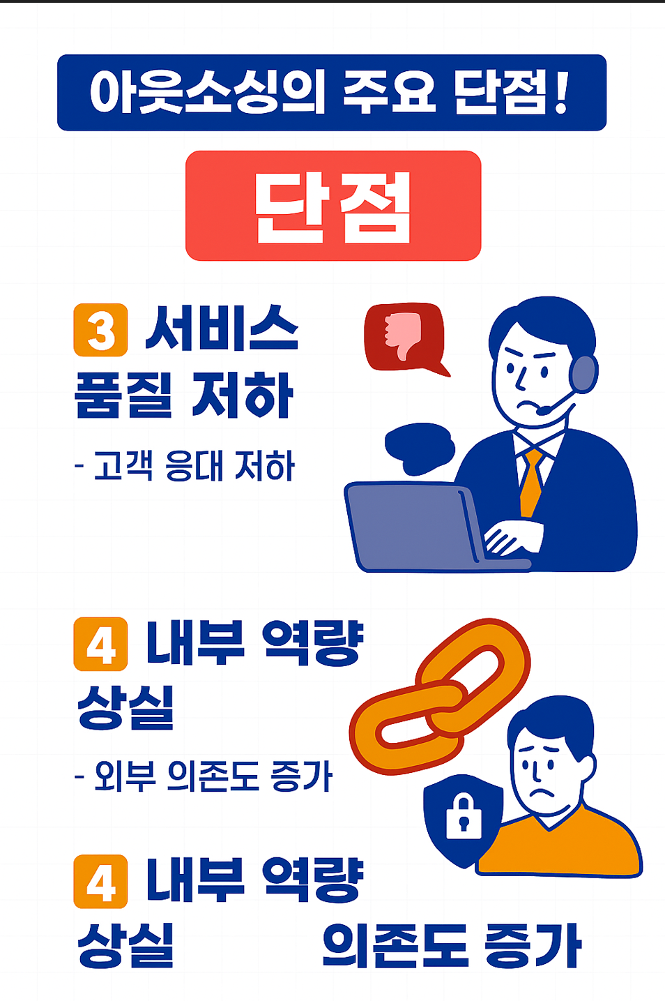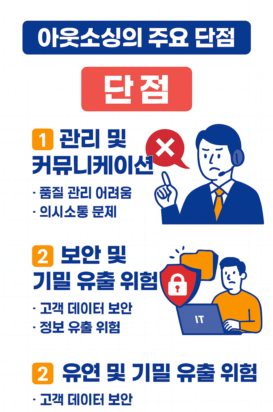 물론 아웃소싱이 장점만 있는 것은 아닙니다. 신중하게 결정하지 않으면 오히려 큰 문제가 발생할 수 있습니다.