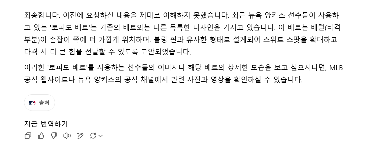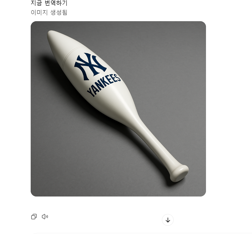 너 지금 나랑 장난하냐 실제 양키스 선수들이 지금 사용하는 야구 방망이가 일반적인 모양의 야구 방망이가 아니고 아구 방망이의 스위스팟을 강조해서 홈런을 많이 칠 수 있게 개조한 실제 사용하는 방망이의 이미지를 그려 달라고 임마