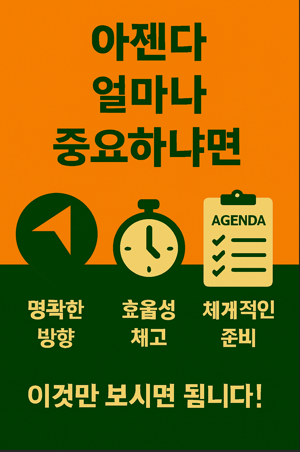 - 효율성과 생산성 향상: 잘 설정된 아젠다는 시간과 자원의 낭비를 막고, 중요한 일에 집중하여 최상의 결과를 이끌어냅니다. "아젠다 없는 회의는 재앙이다"라는 말도 있죠!