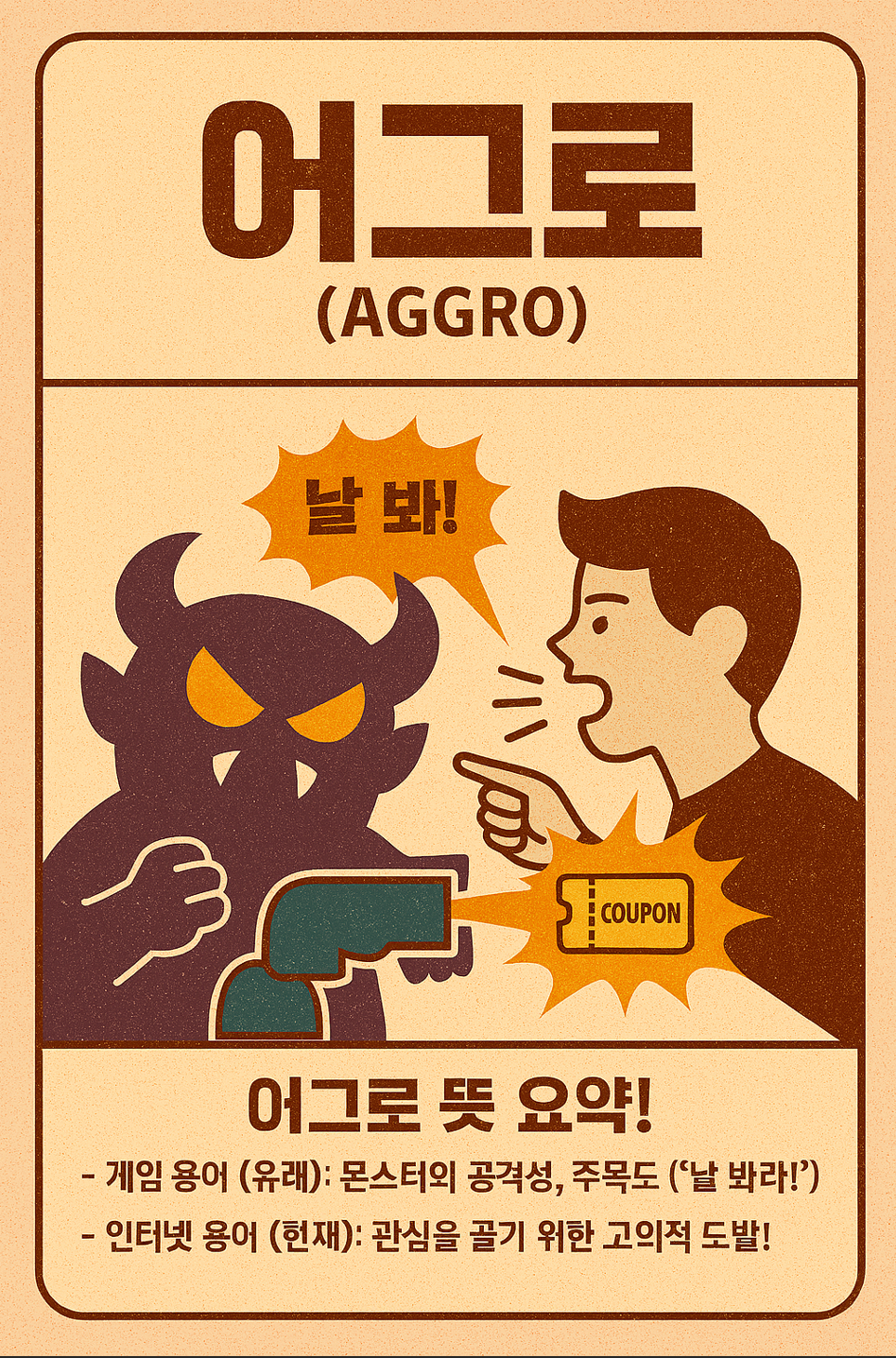 이 '어그로'라는 단어는 원래 게임에서 쓰이던 용어인데, 지금은 인터넷과 일상생활 전반으로 퍼져 아주 중요한 키워드가 되었습니다.