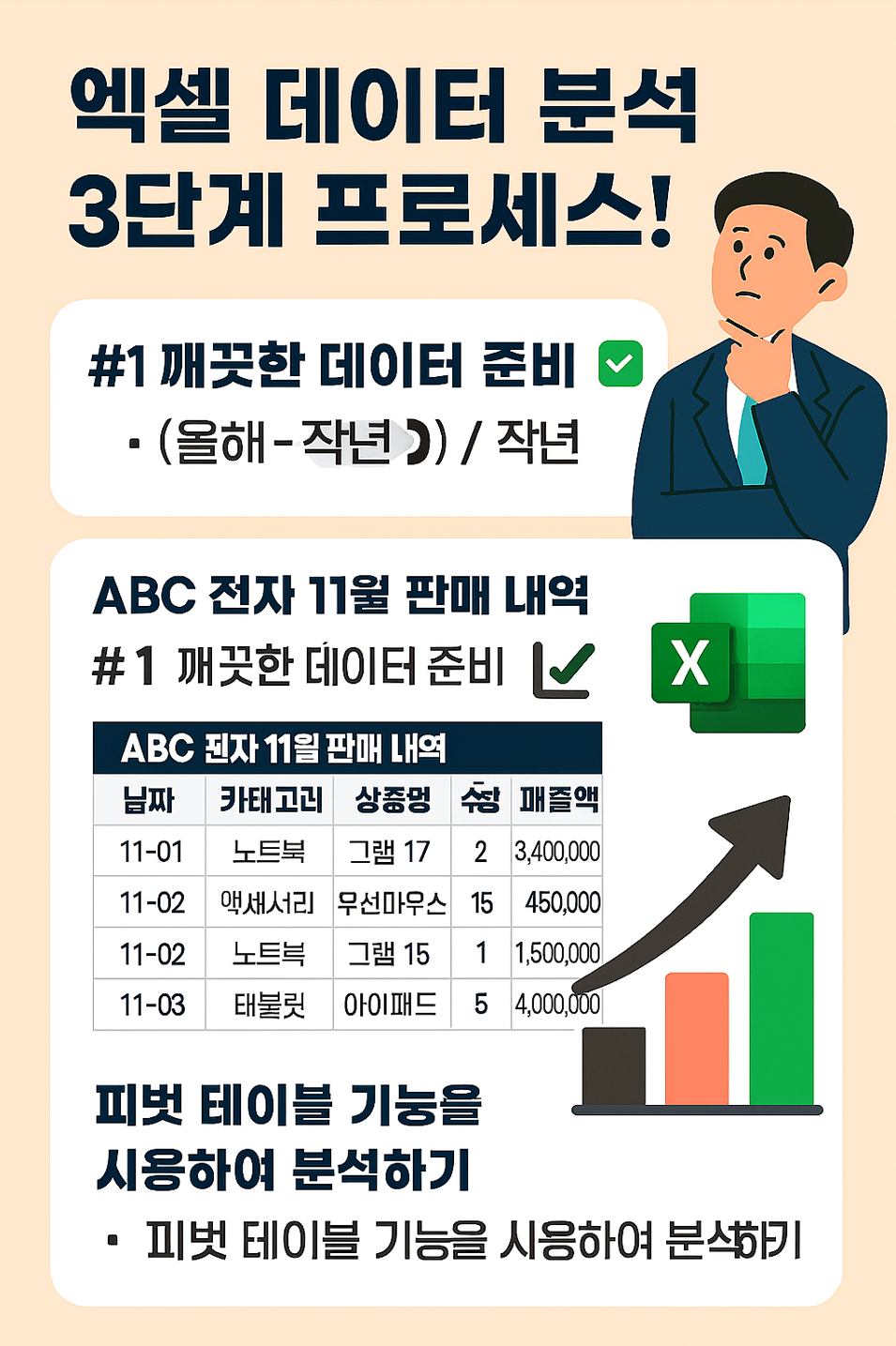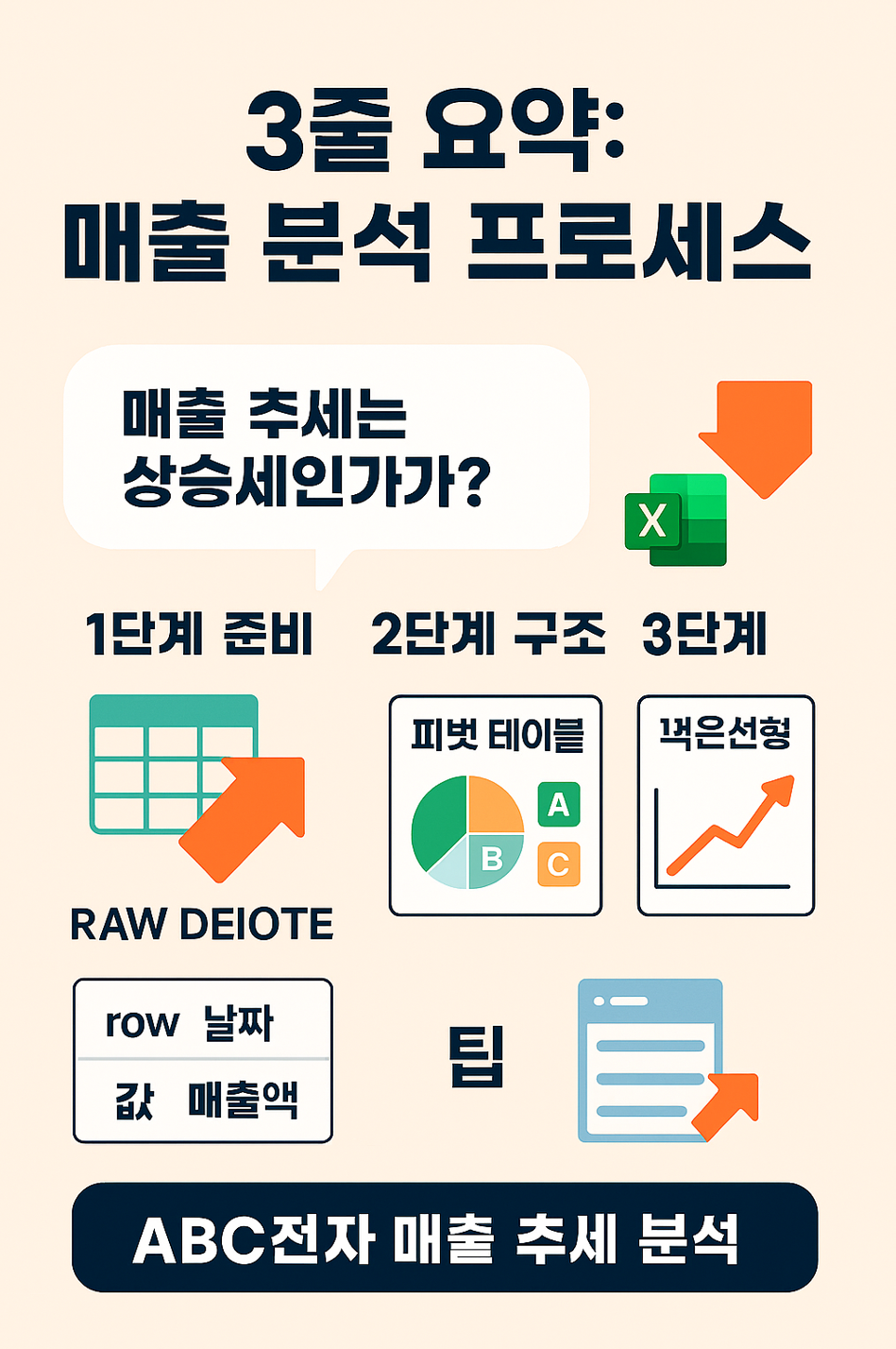 엑셀 데이터 분석, 어렵지 않습니다. 복잡한 함수를 몰라도 '피벗 테이블(Pivot Table)' 기능 하나만 제대로 쓰면 전문가처럼 분석할 수 있습니다. 오늘은 가상의 'ABC 전자' 매출 데이터를 가지고, 실무에서 바로 써먹는 분석 3단계 프로세스를 보여드리겠습니다.