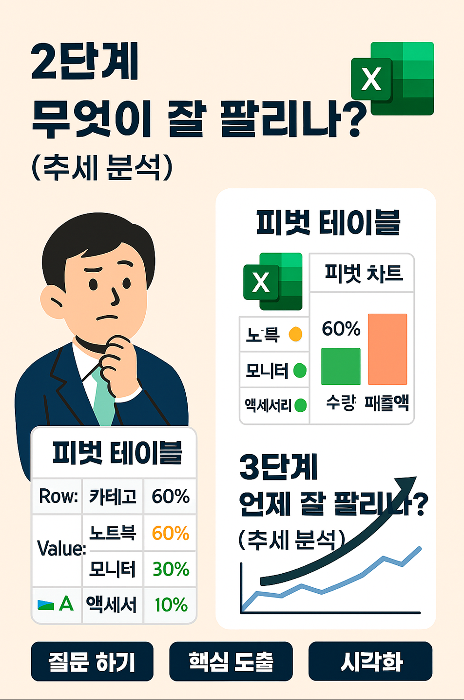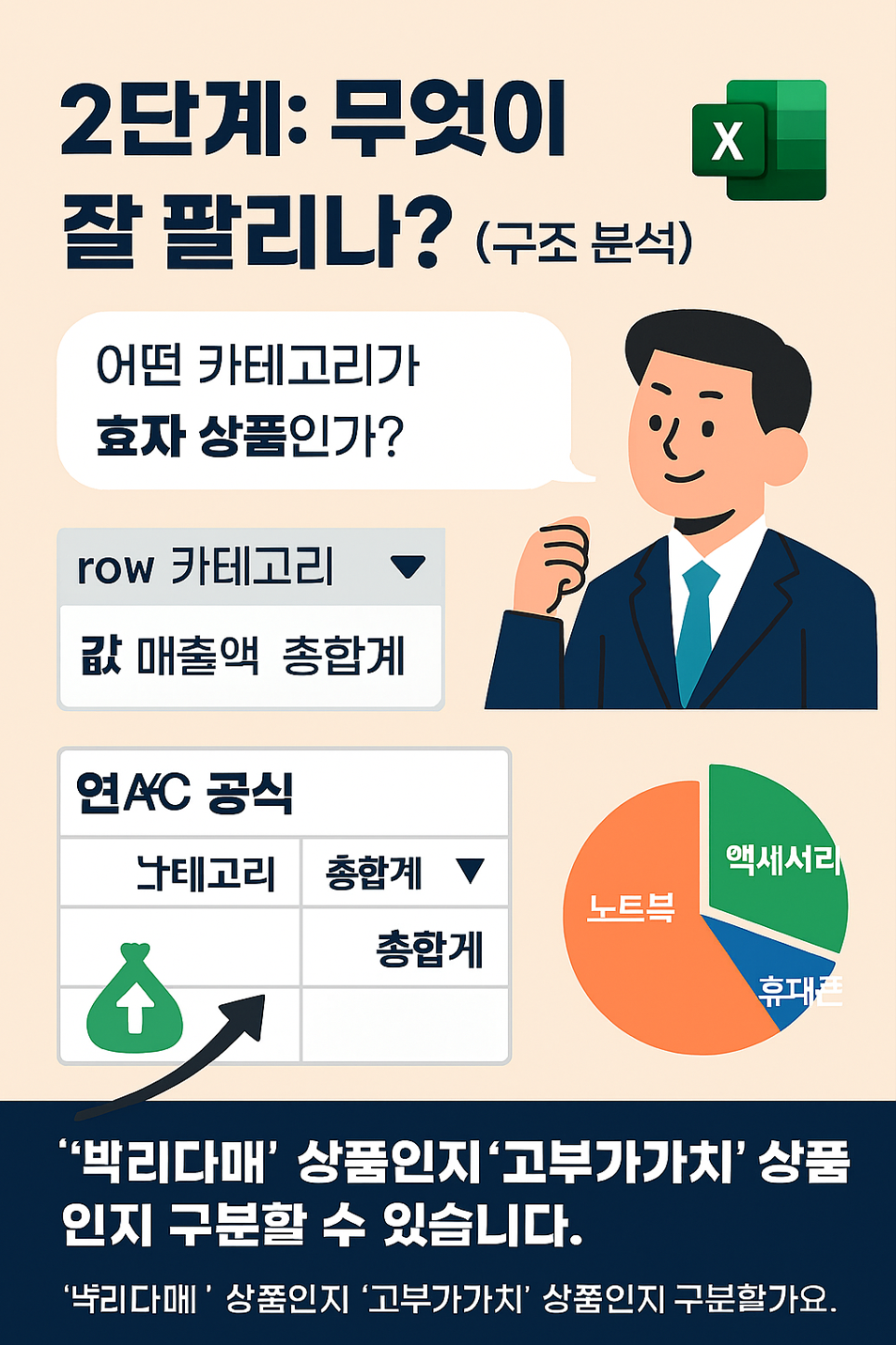 결과: "노트북이 전체 매출의 60%를 차지하지만, 판매 건수는 액세서리가 70%로 가장 많음"을 파악 가능!
